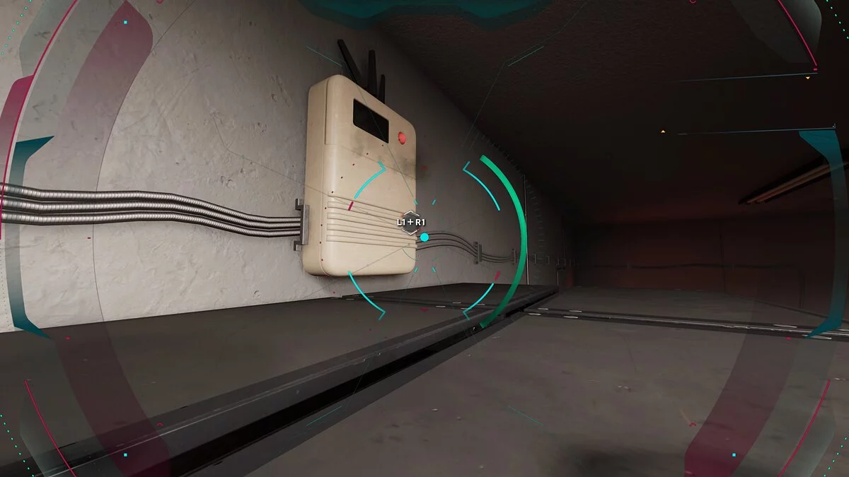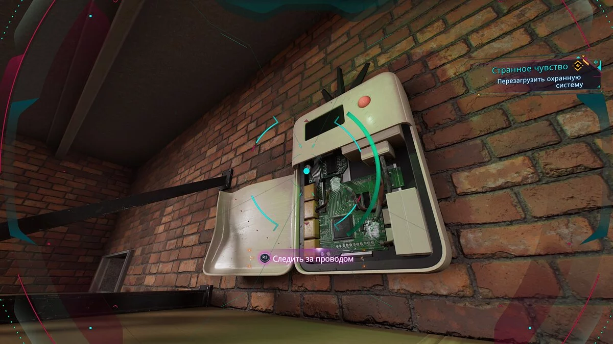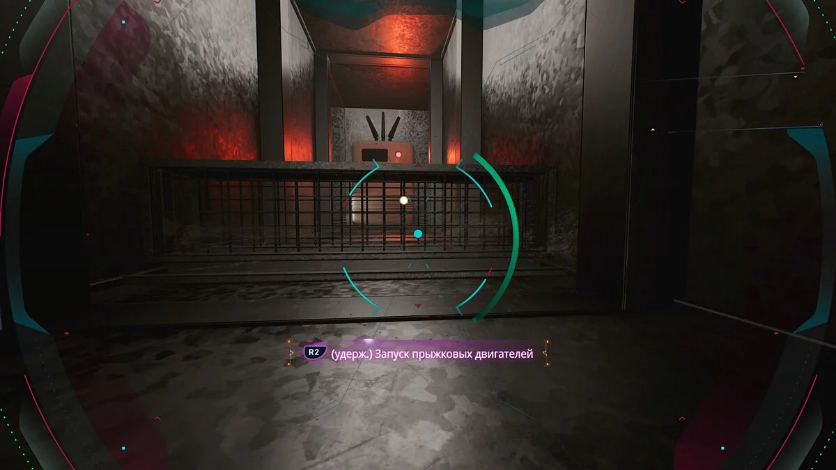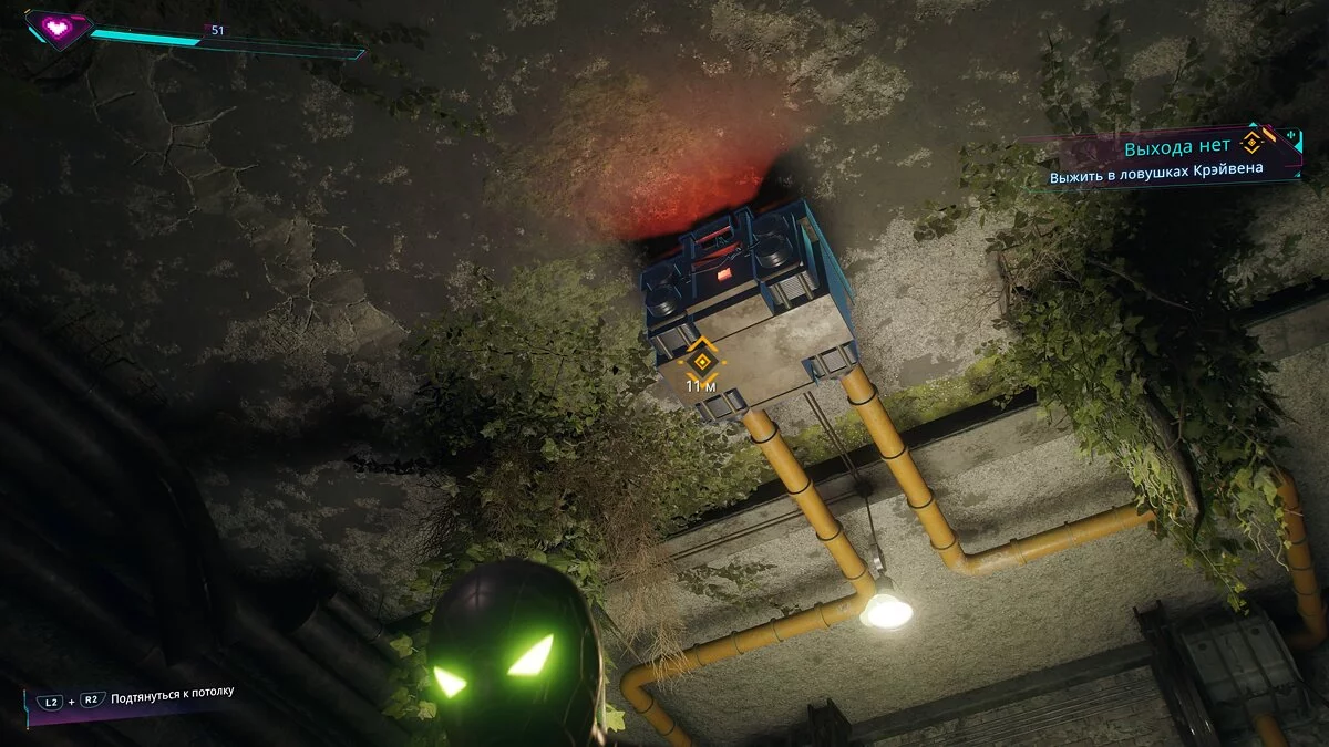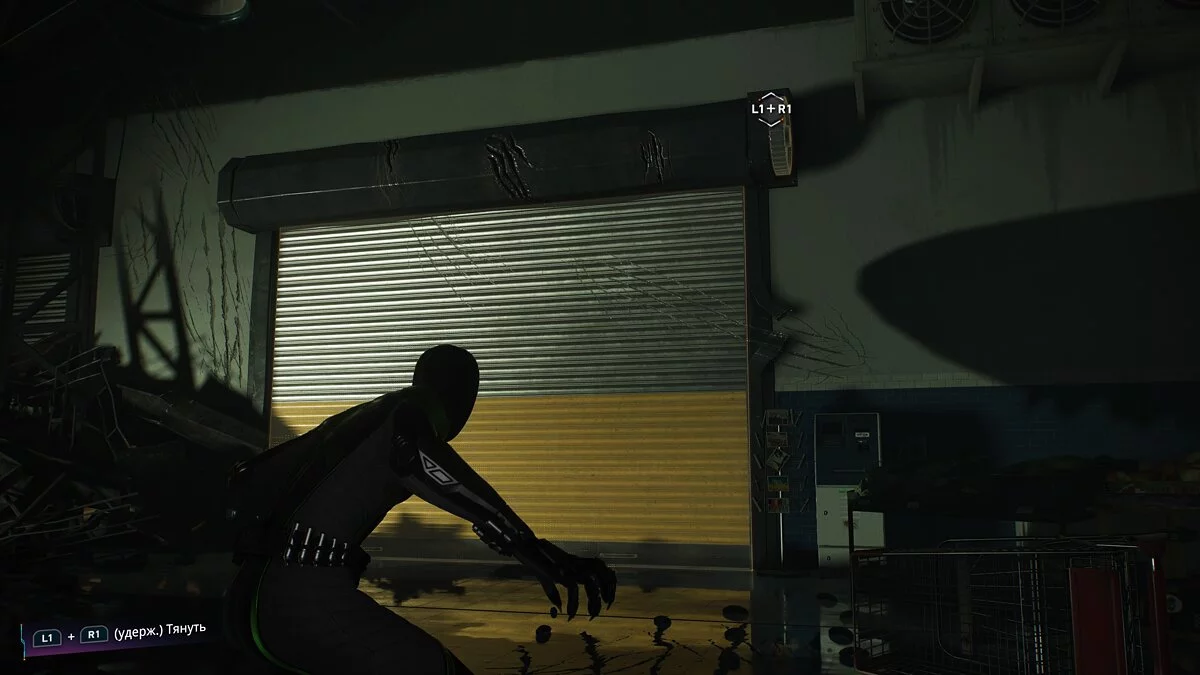 Попробуйте открыть дверь. У вас ничего не получится, поэтому возникнет идея — добраться до аварийного генератора. Сломайте решётку и прыгните вперёд. Вам нужно идти вдоль линии электроснабжения. Чтобы увидеть её, нажмите кнопку R3.