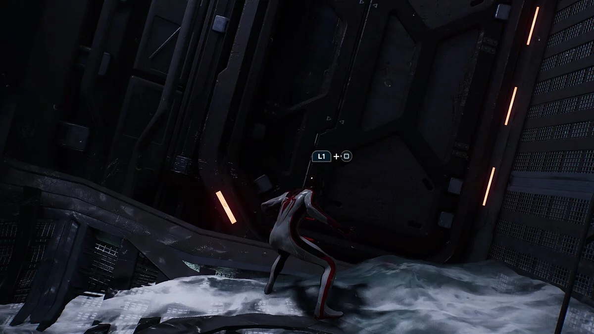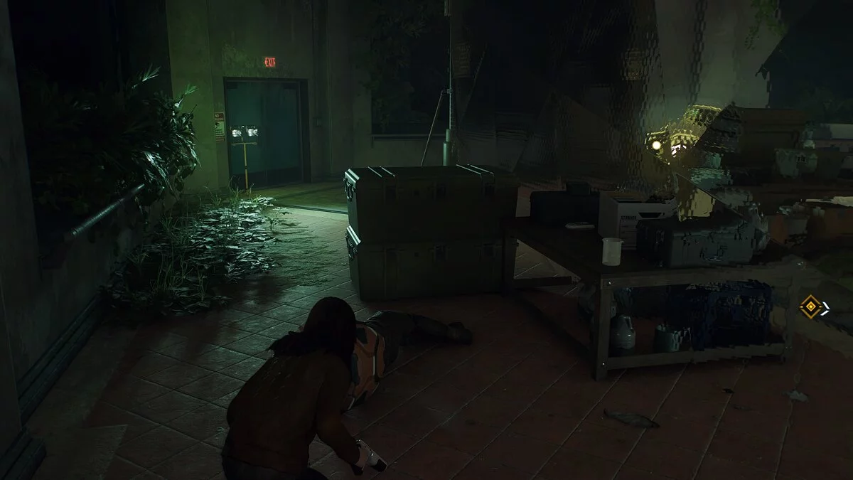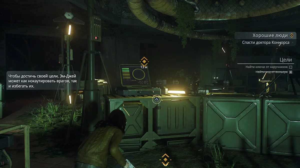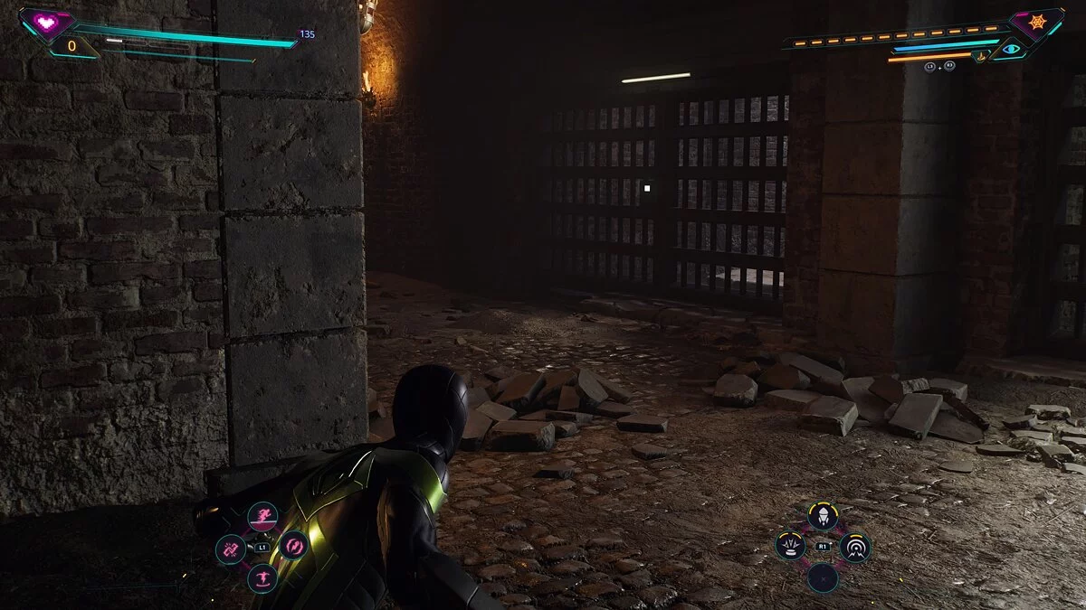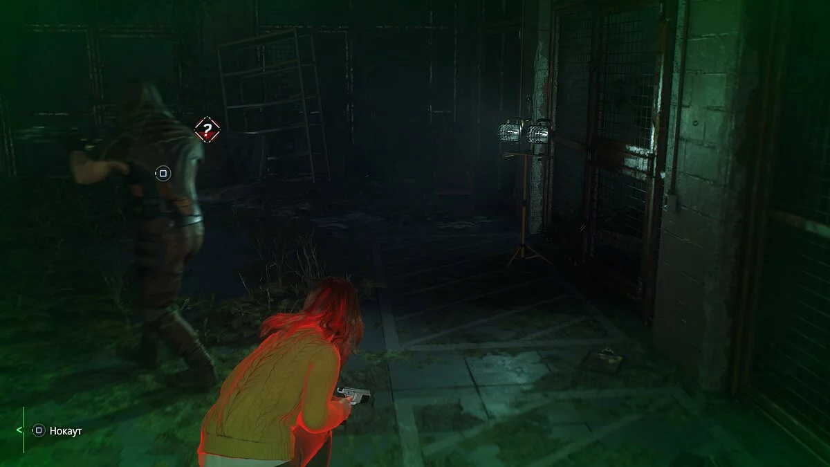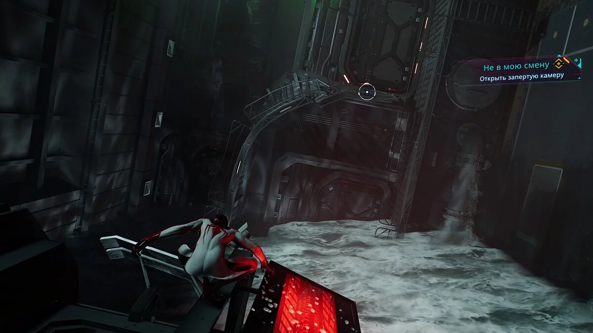 Попробуйте открыть дверь. У вас ничего не получится, поэтому возникнет идея — добраться до аварийного генератора. Сломайте решётку и прыгните вперёд. Вам нужно идти вдоль линии электроснабжения. Чтобы увидеть её, нажмите кнопку R3.