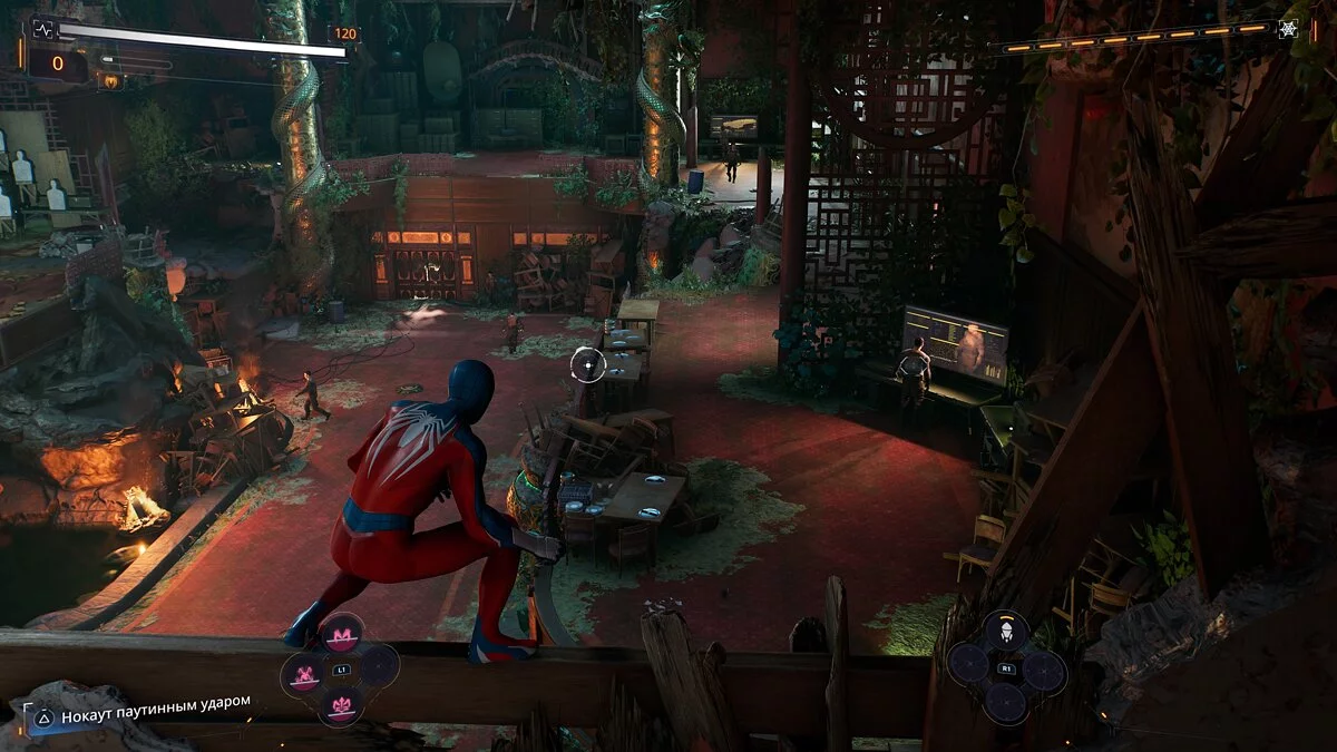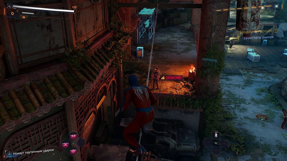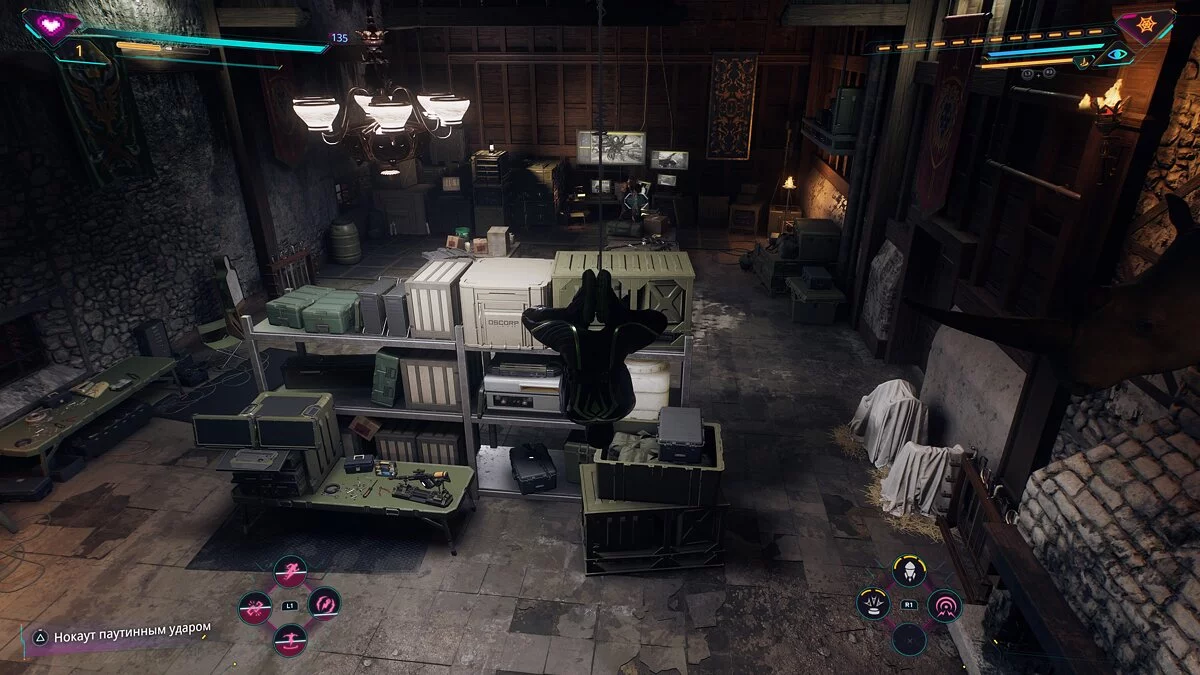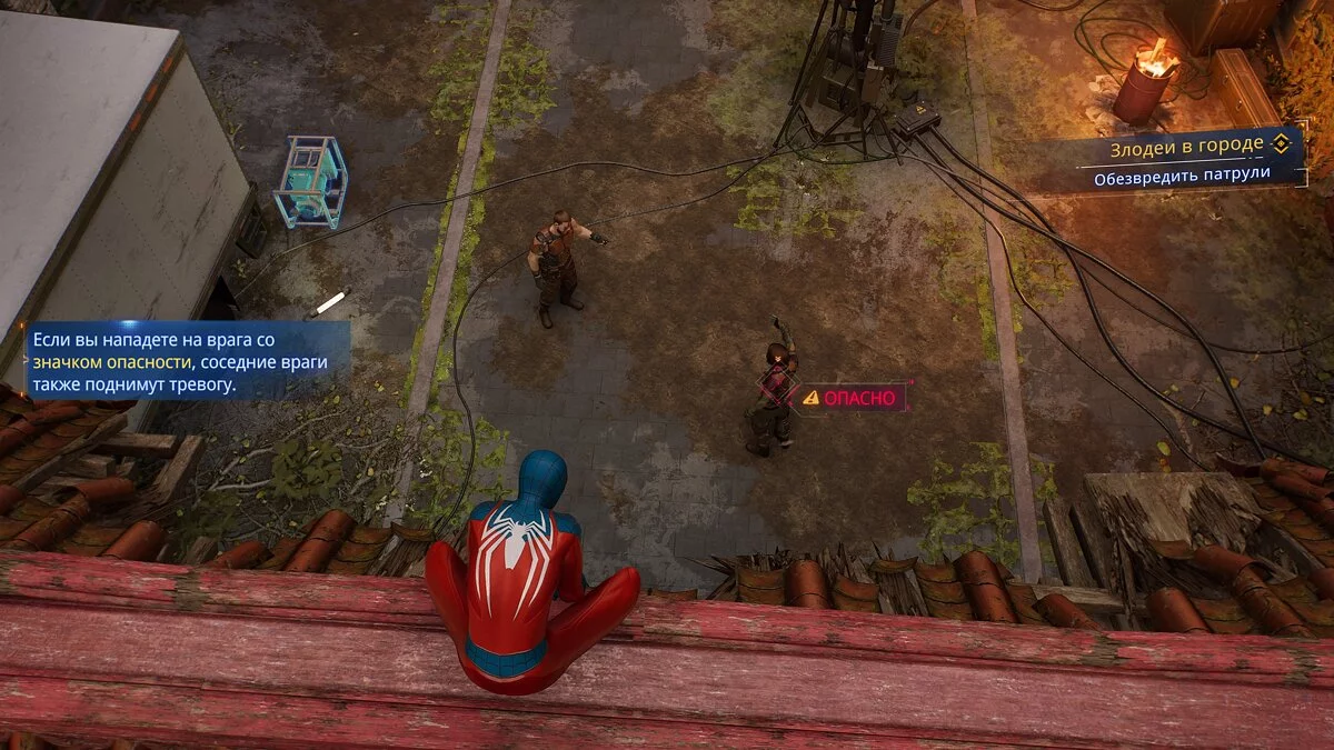 При помощи паутинных крыльев летите к основной базе бандитов. Здесь вы познакомитесь с механикой стелса в игре. Если над противником висит значок «Опасно», это означает, что его атаковать опасно — другие враги заметят ваше действие.