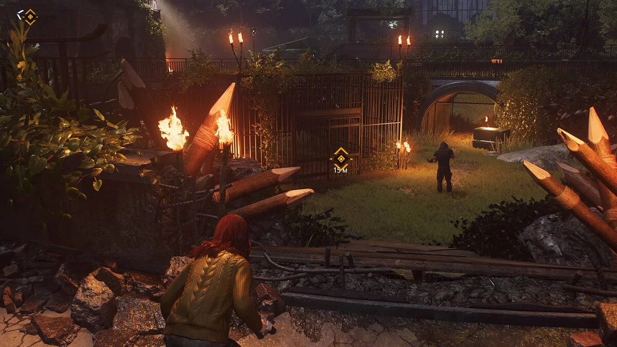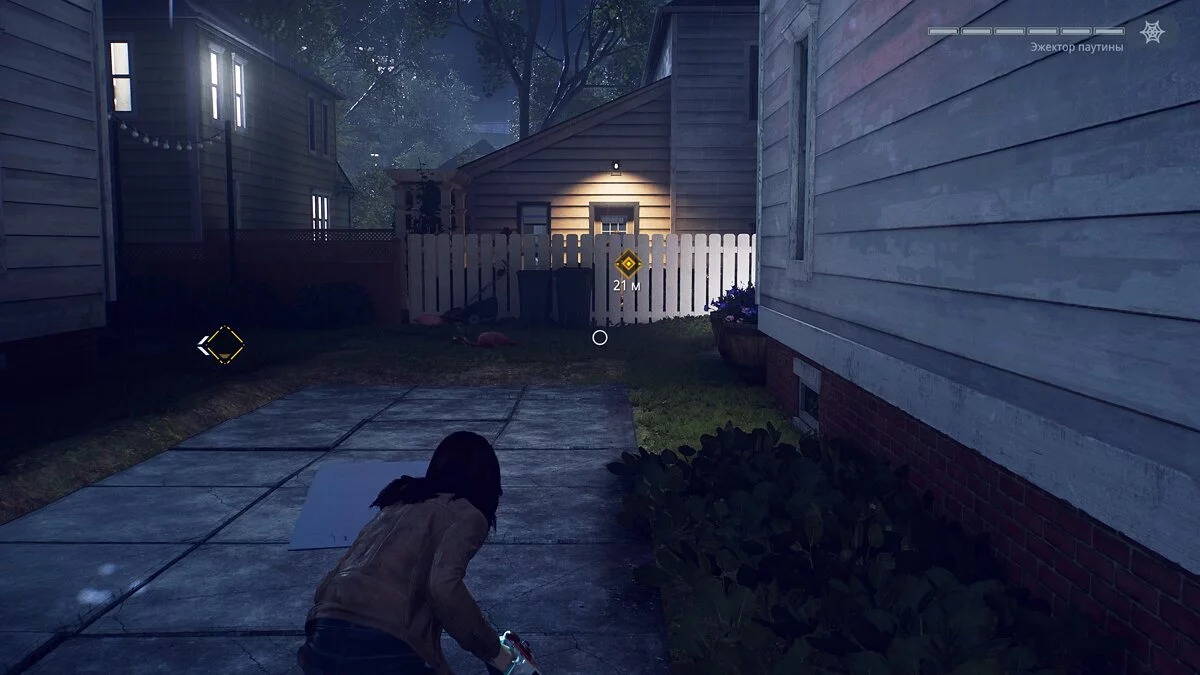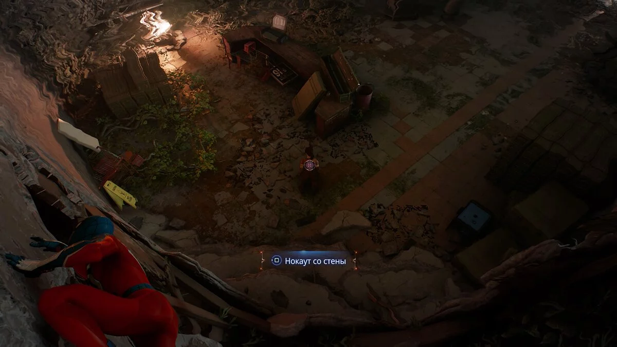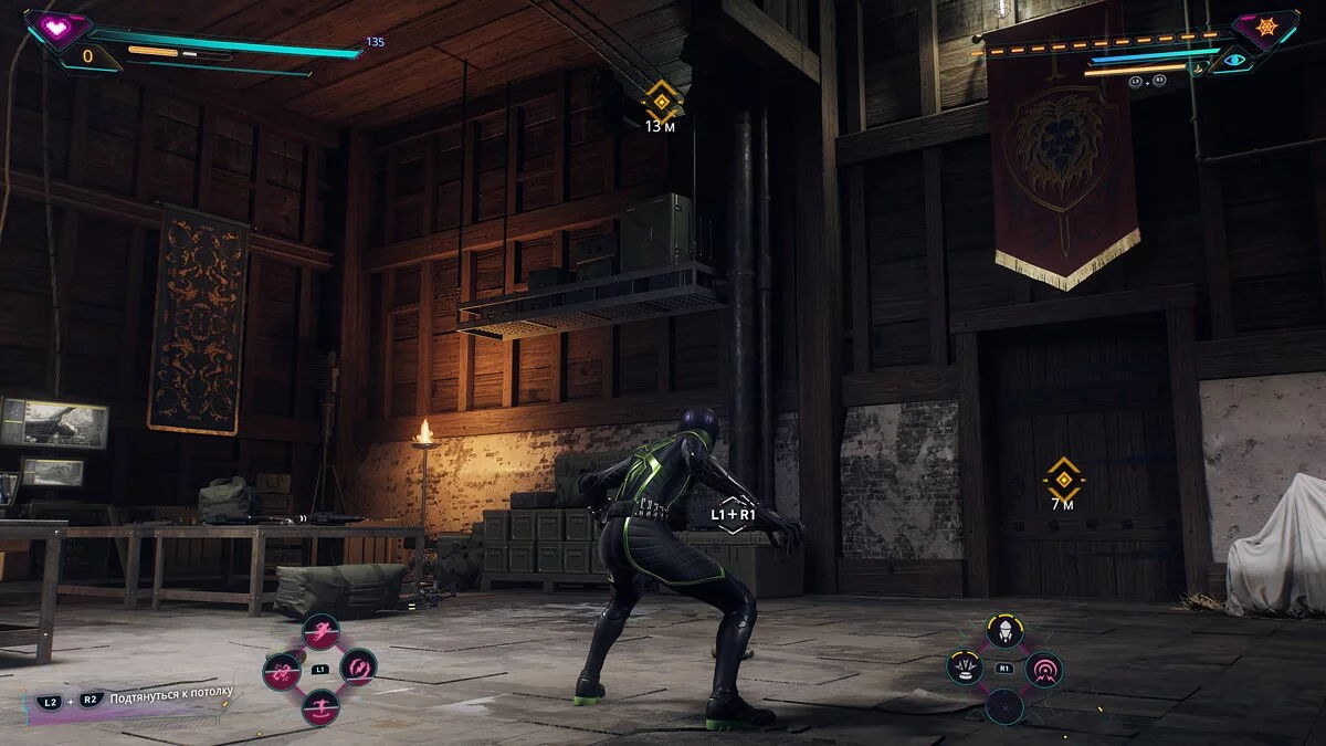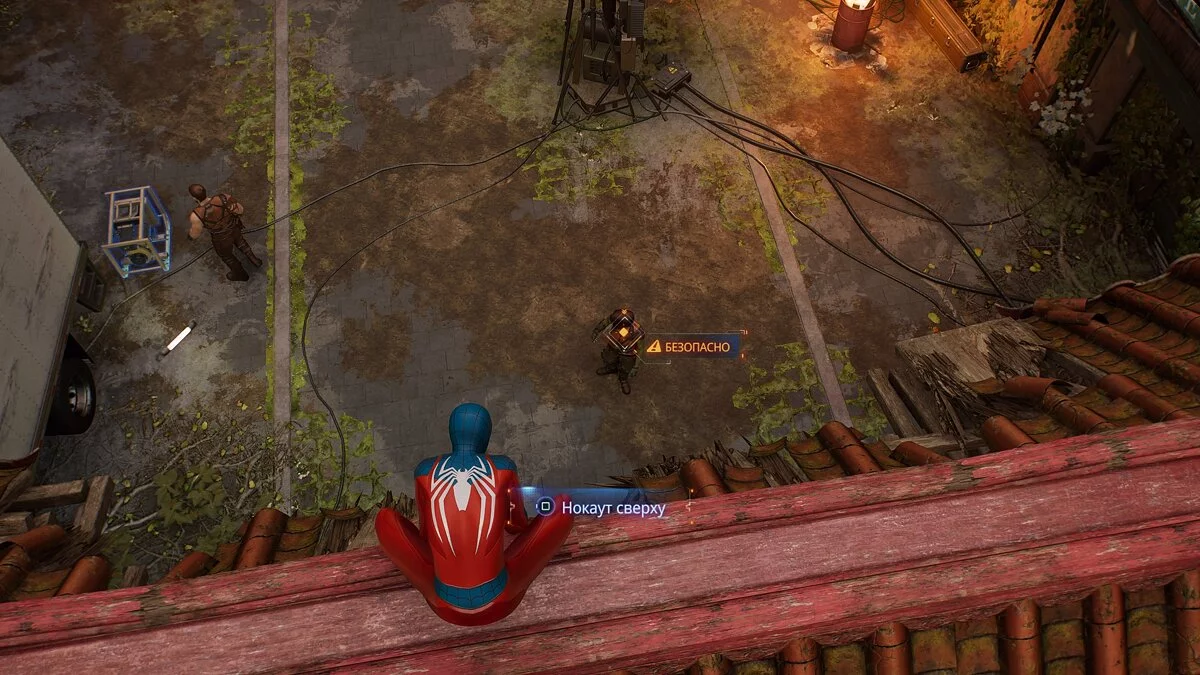 При помощи паутинных крыльев летите к основной базе бандитов. Здесь вы познакомитесь с механикой стелса в игре. Если над противником висит значок «Опасно», это означает, что его атаковать опасно — другие враги заметят ваше действие.