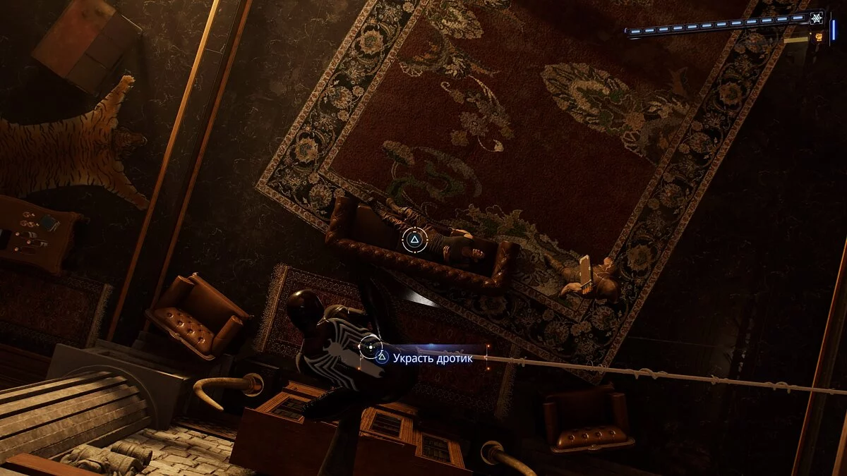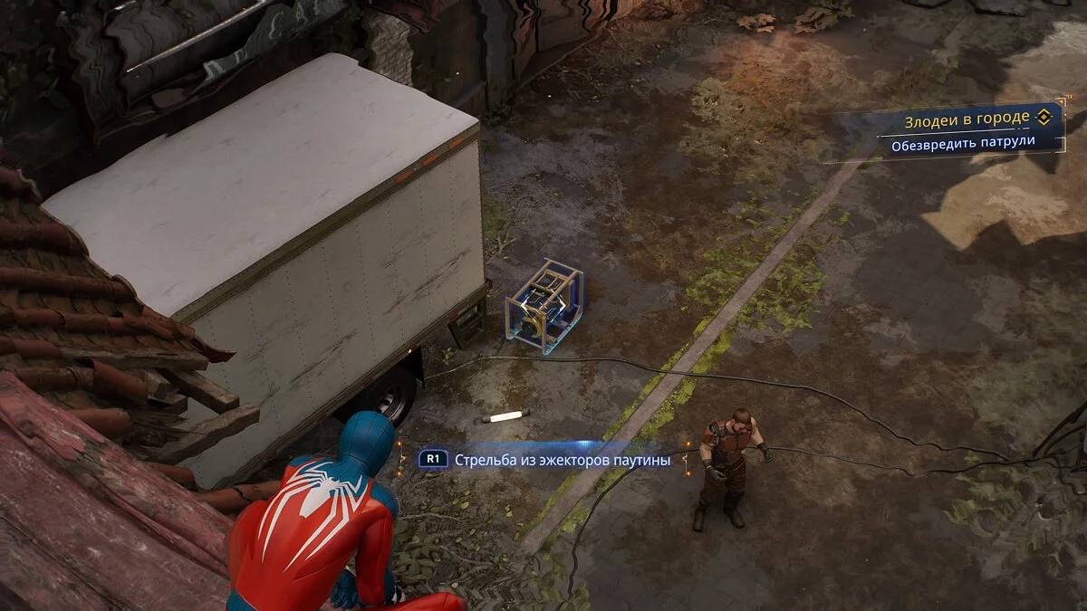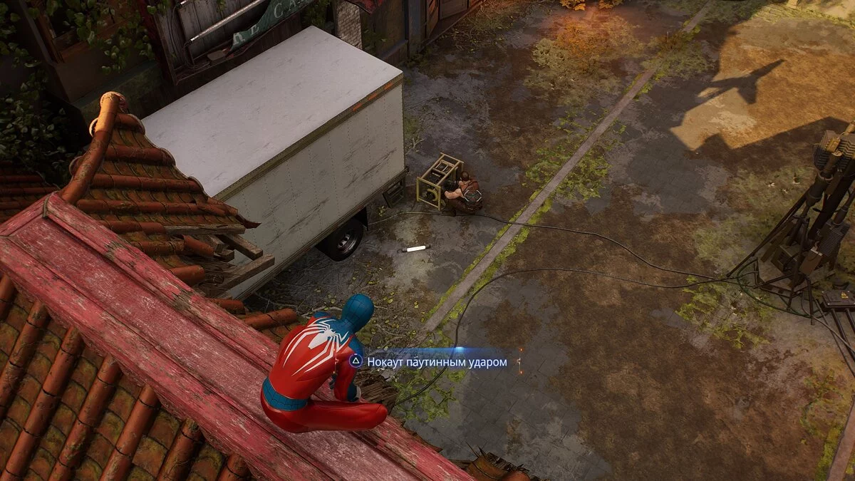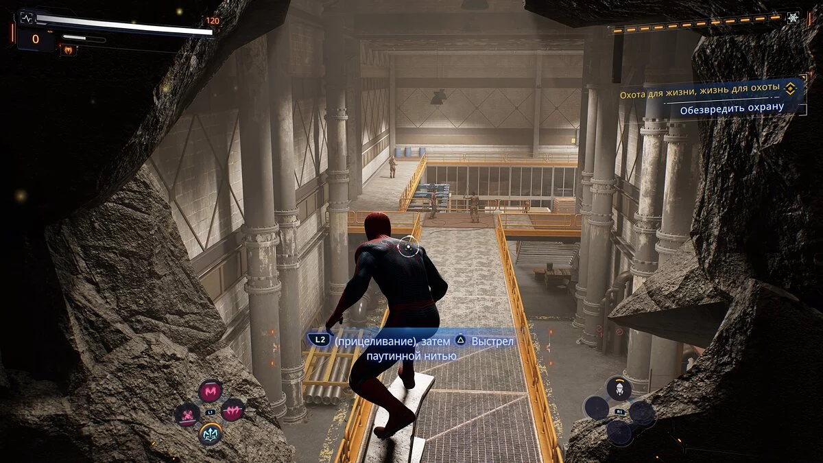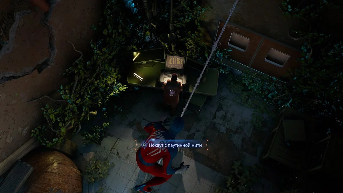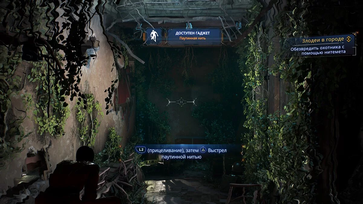 Нокаутируйте человека Крейвена и осмотрите крюк-кошку. Таким образом вы получите доступ к новому гаджету — паутинной нити. Прицельтесь при помощи L2 и выстрелите над противником клавишей «треугольник». Подойдите к охотнику сверху и вырубите его.