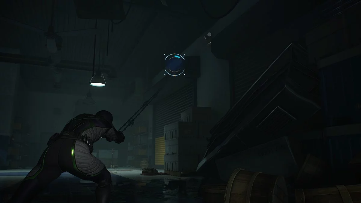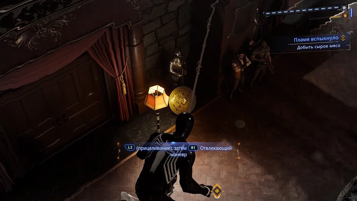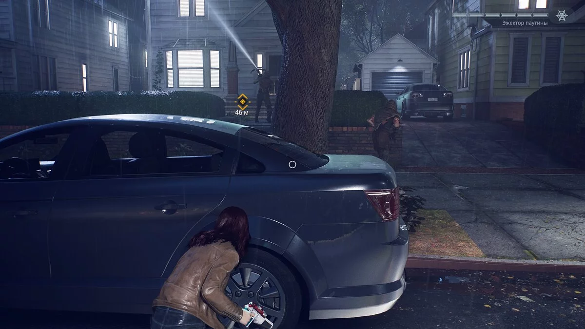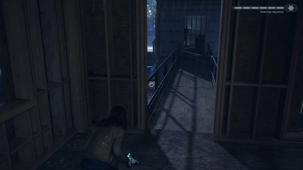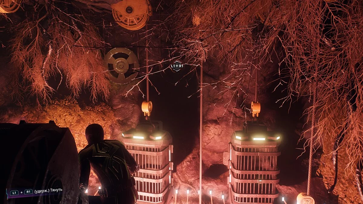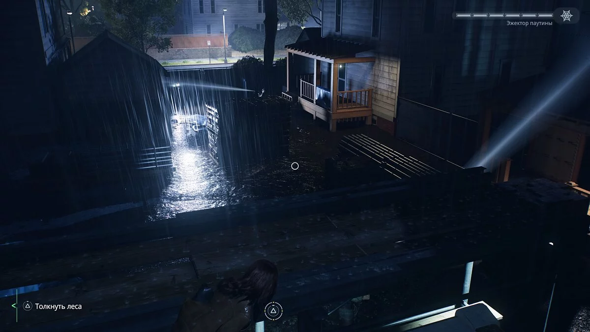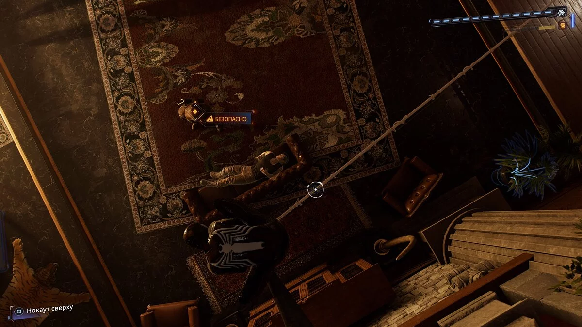 Нокаутируйте человека Крейвена и осмотрите крюк-кошку. Таким образом вы получите доступ к новому гаджету — паутинной нити. Прицельтесь при помощи L2 и выстрелите над противником клавишей «треугольник». Подойдите к охотнику сверху и вырубите его.