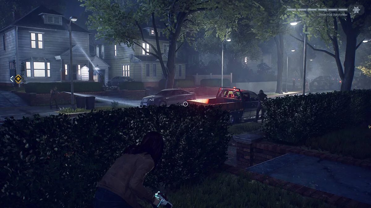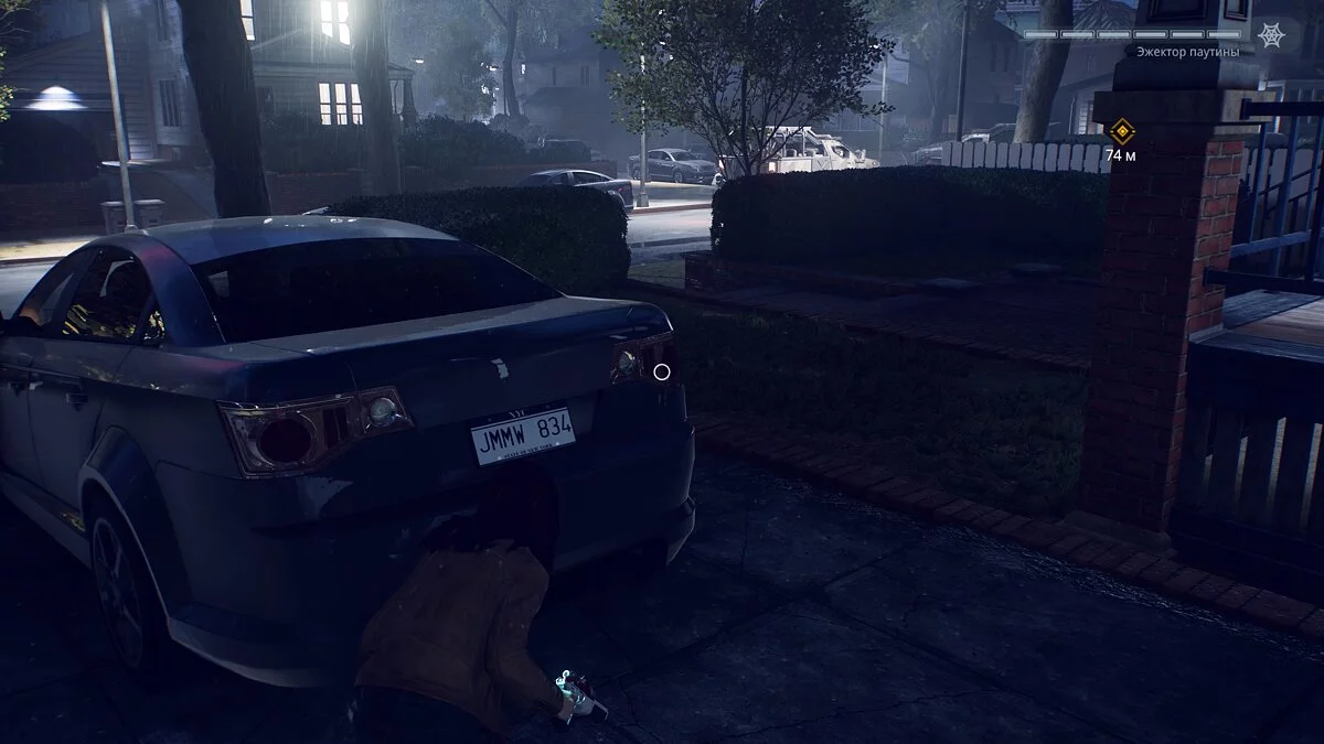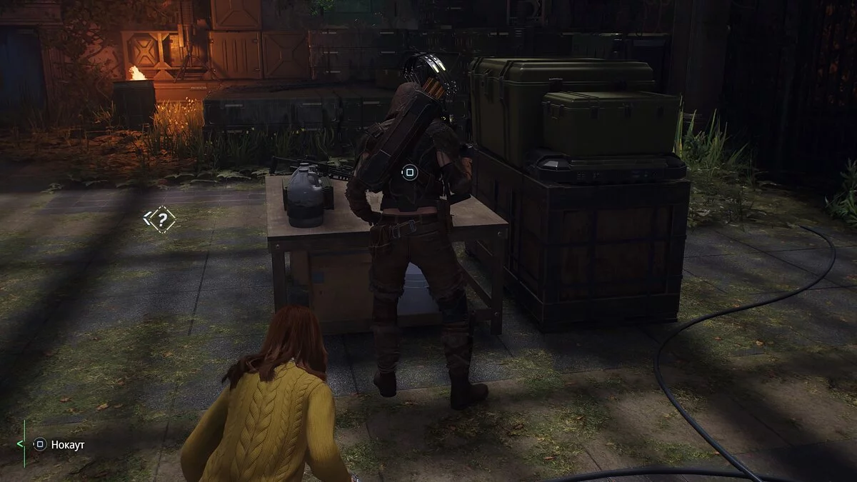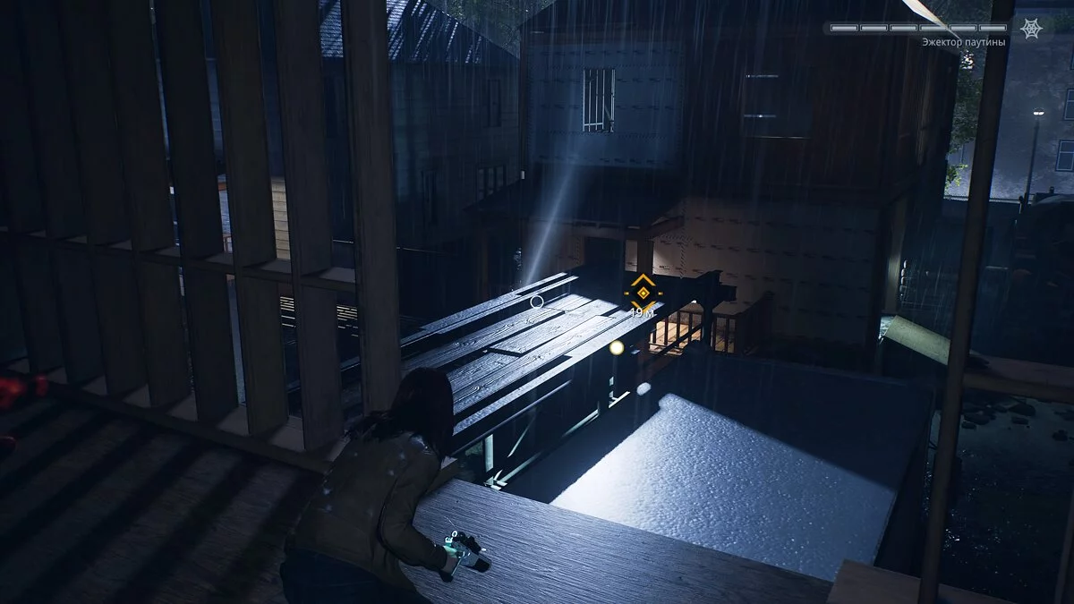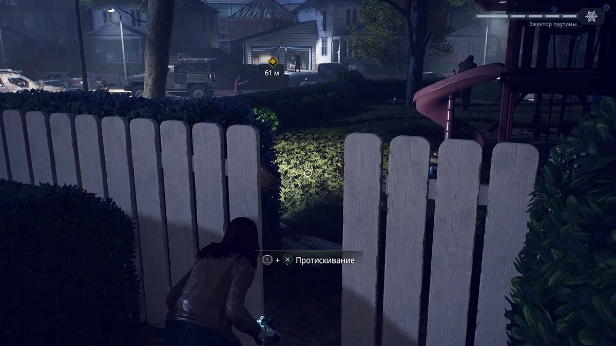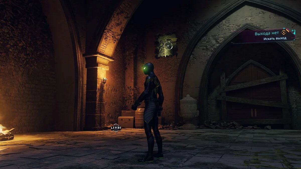 Нокаутируйте человека Крейвена и осмотрите крюк-кошку. Таким образом вы получите доступ к новому гаджету — паутинной нити. Прицельтесь при помощи L2 и выстрелите над противником клавишей «треугольник». Подойдите к охотнику сверху и вырубите его.