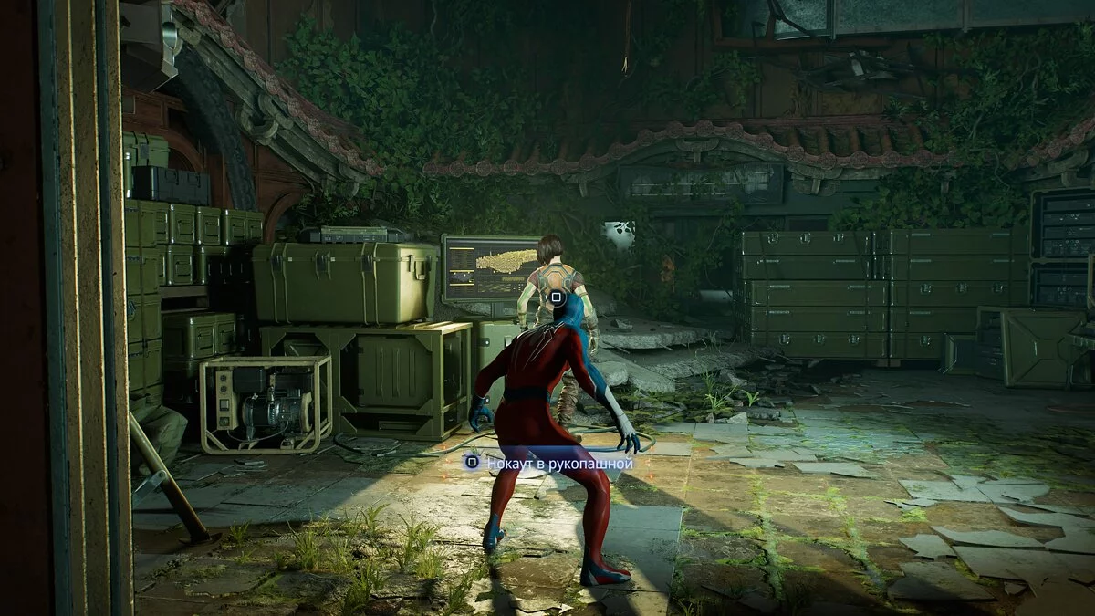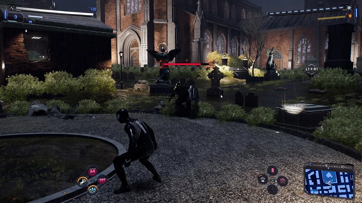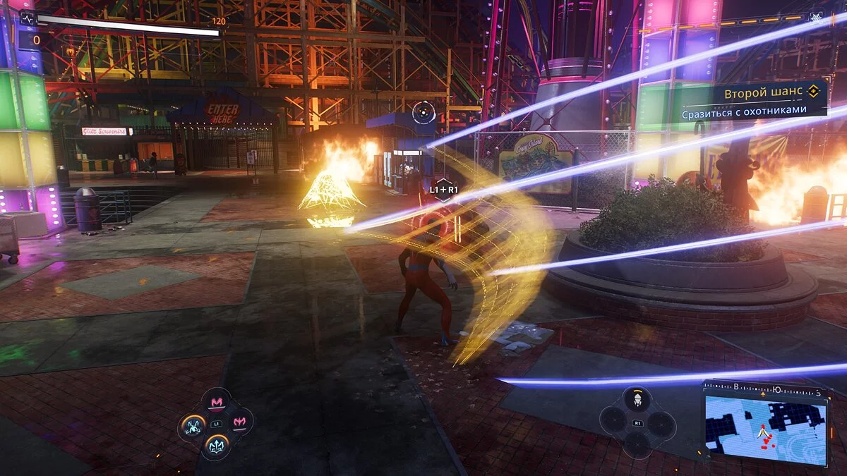 Во время сражений со второй группой противников вы сможете применять Паучий шквал. Для этого одновременно нажмите L1+«квадрат». Эта атака требует перезарядки, которая будет происходить за счёт успешных ударов по врагам. При желании в них можно бросать предметы (L1+R1). После завершения сражения вас ждёт кат-сцена.