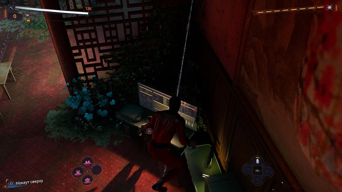 В следующей комнате вас ждёт много бойцов, но их легко обезвредить по-тихому. Натягивайте около противника паутинную нить, подходите к нему сверху и атакуйте. Таким образом можно без проблем зачистить всё помещение.