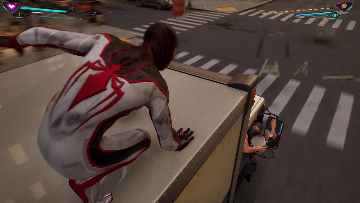 После видеоролика вы получите первое очко навыков и увидите как устроена местная система прокачки. Она делится на три ветки — умения Питера, Майлза и совместные перки. Вам нужно перейти в меню Паркера и выбрать «Паучий подброс». Благодаря сочетанию клавиш L1+«крестик» вы сможете подкидывать противников в воздух. Причём приём работает даже против мощных врагов. Он особенно эффективен во время сражений с большими группами вооружённых преступников.
