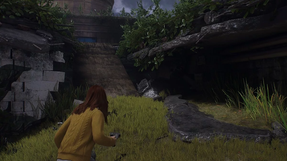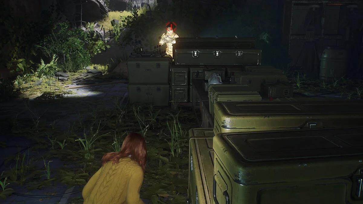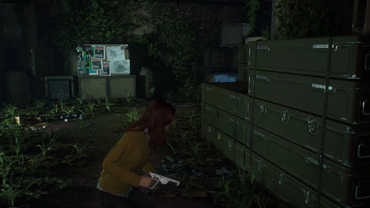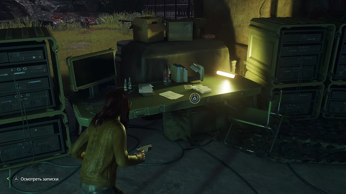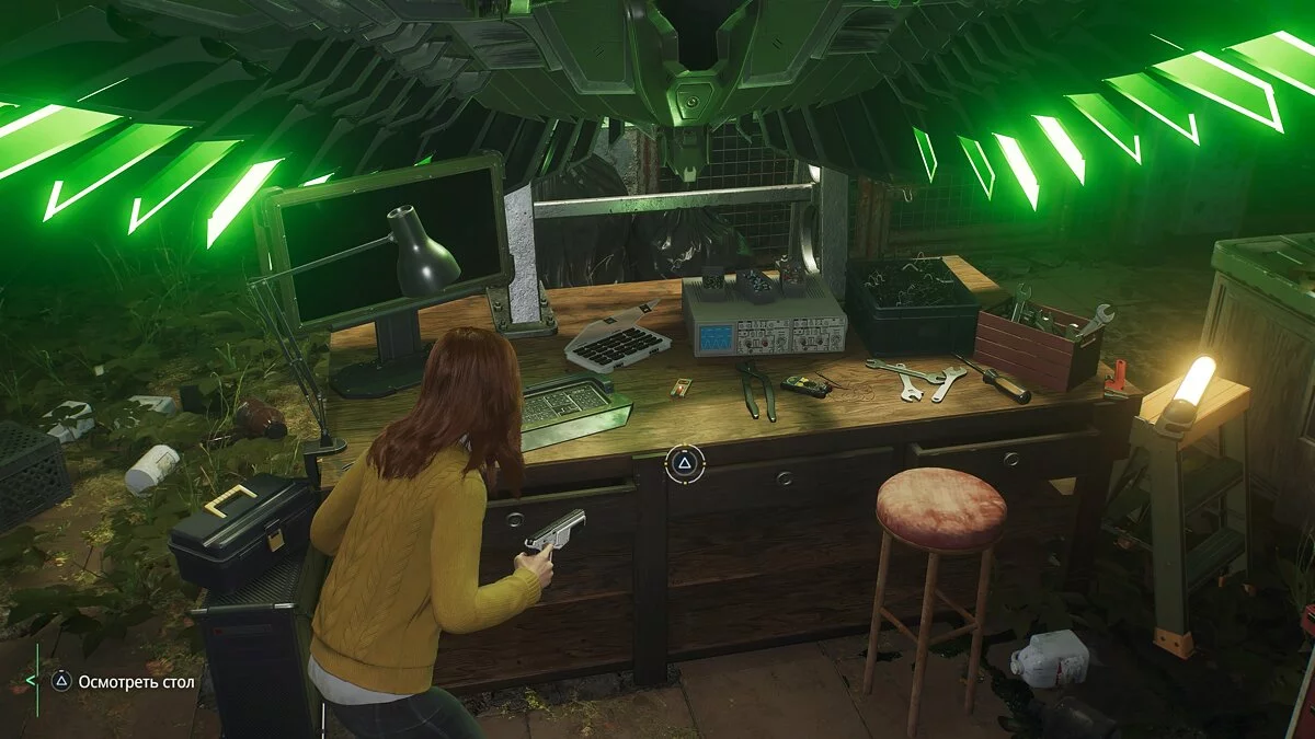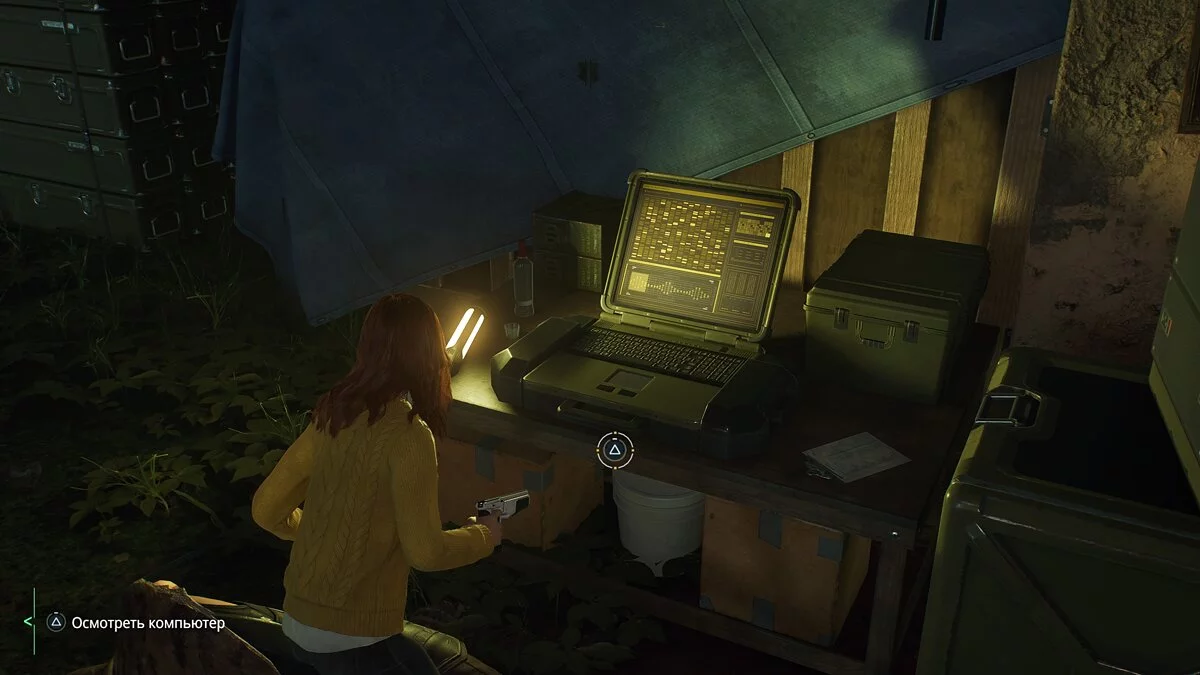 За ними находится лабораторное оборудование, которое нужно изучить. Выстрелите из арбалета и осмотрите зелёную броню, в которую попал болт.