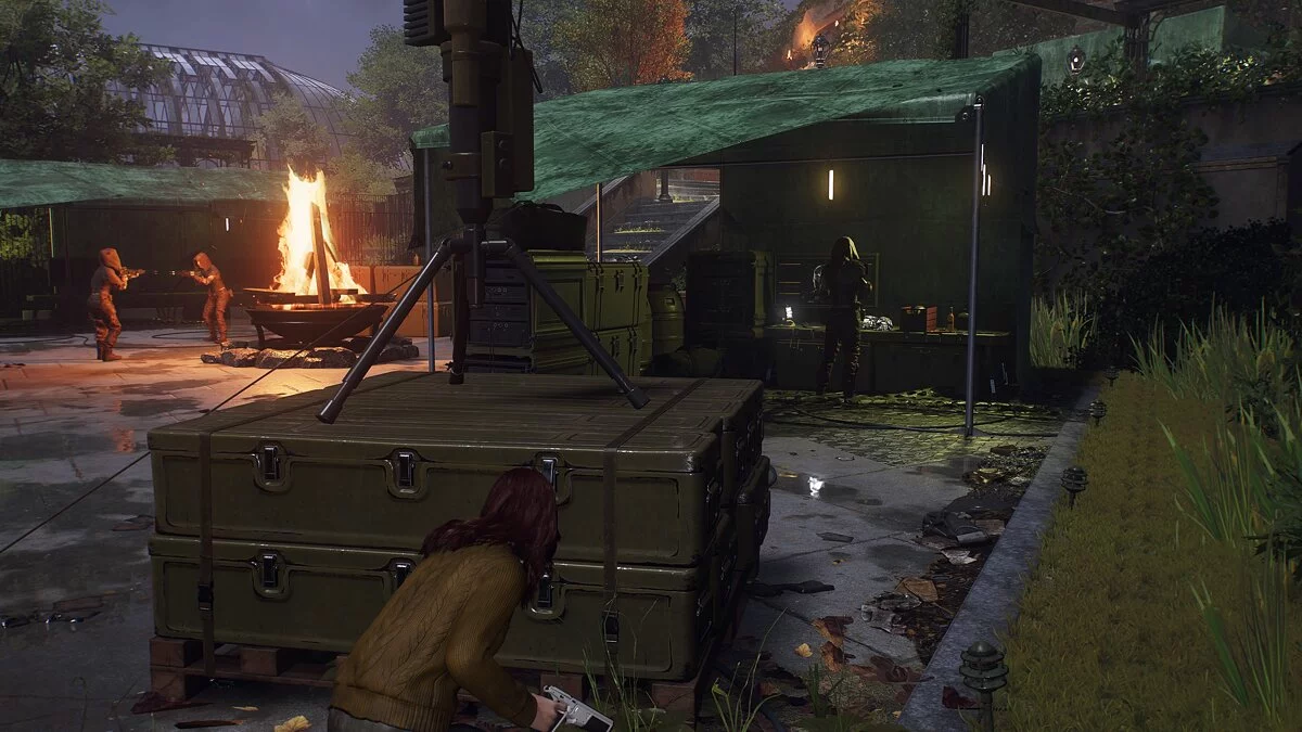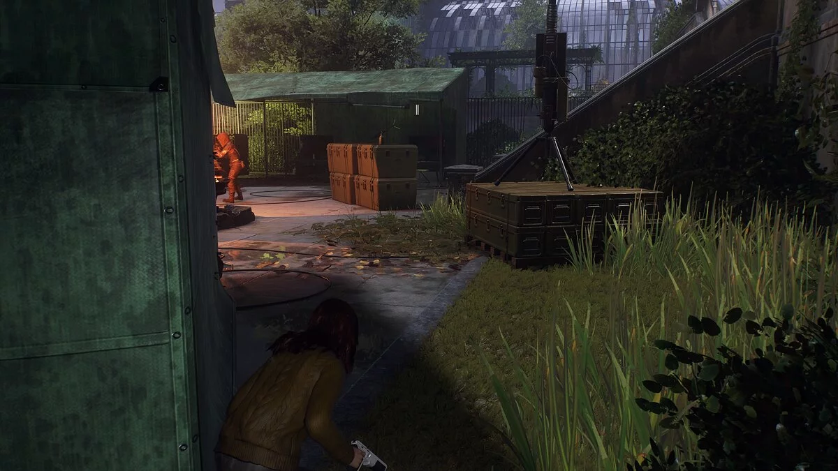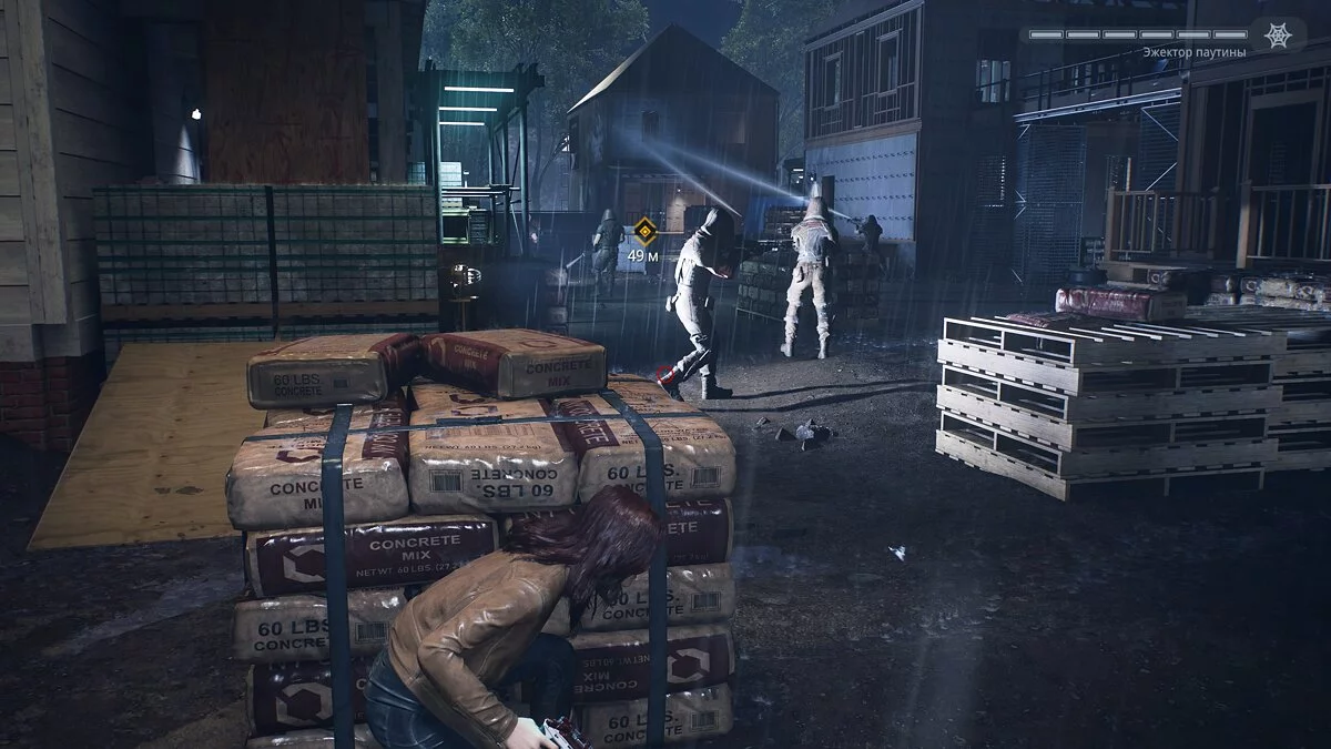 Перед следующей целью стоят двое бойцов. Когда девушка отойдёт в сторону, атакуйте парня и двигайтесь дальше. По лестнице справа поднимайтесь на второй этаж и обезвреживайте всех, кто встанет на вашем пути. Толкните леса и забирайтесь в дом.