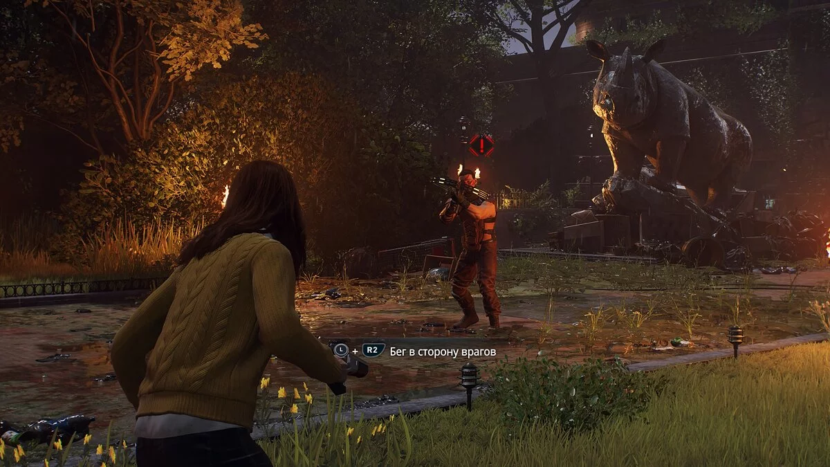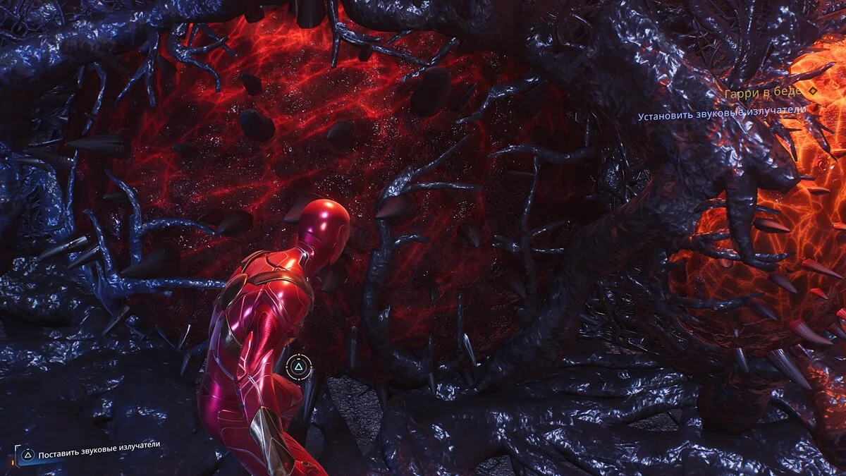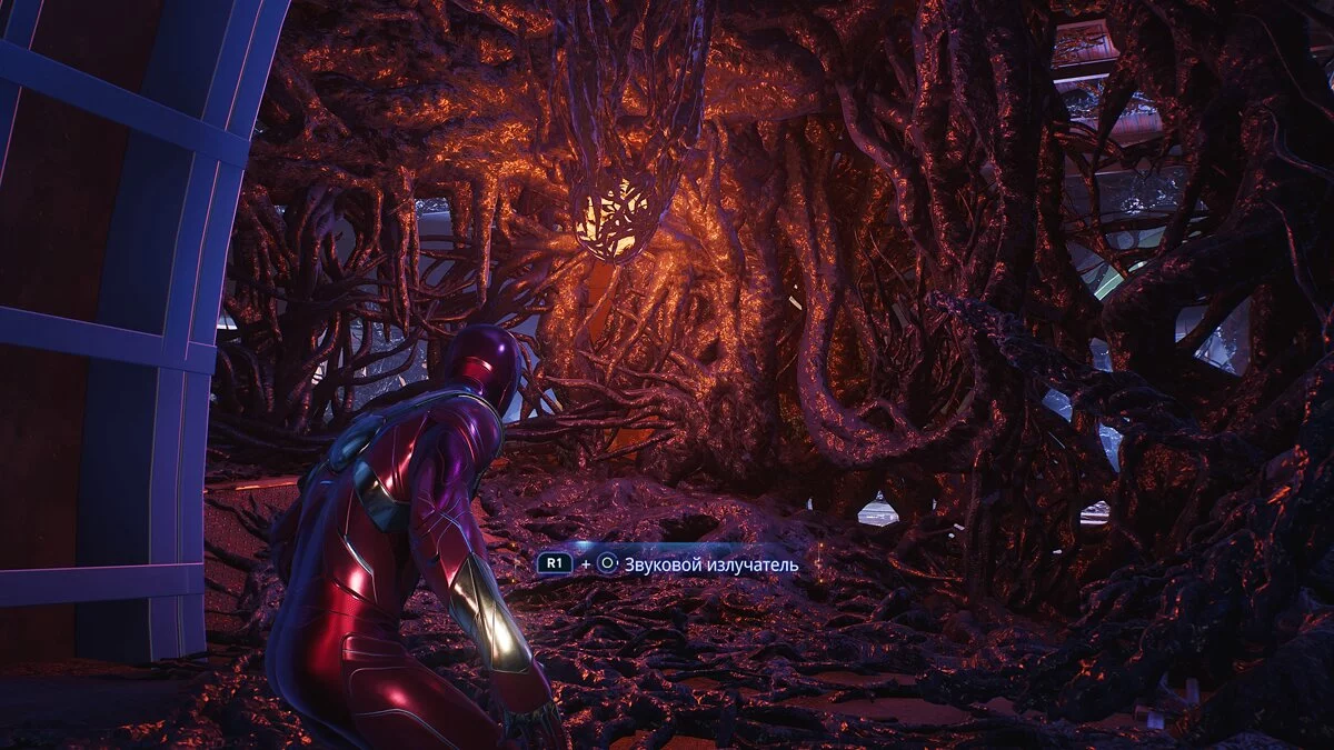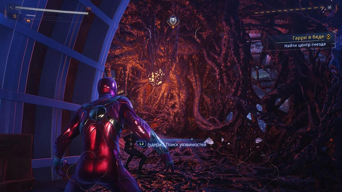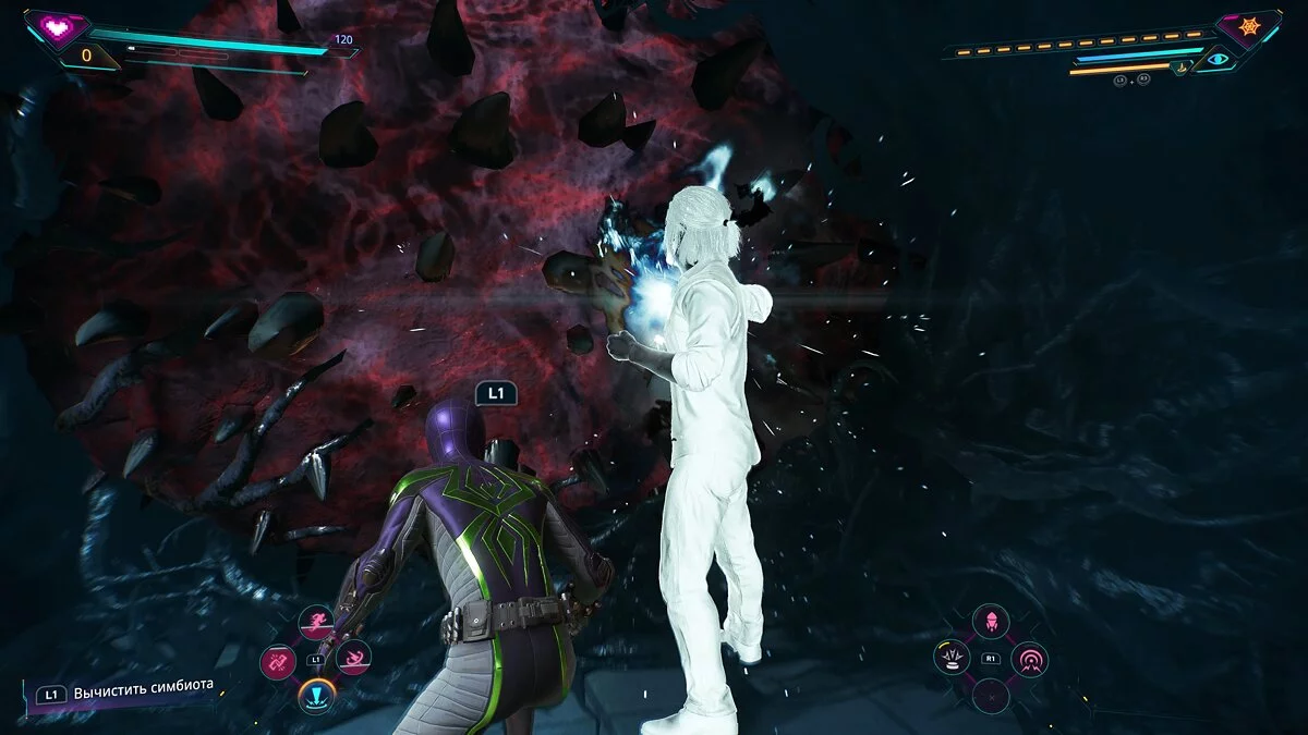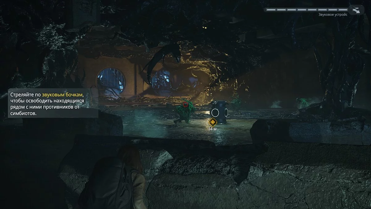 Играем за Питера. Используйте звуковой излучатель (R1+«кружок»), чтобы оглушать симбиотов.
