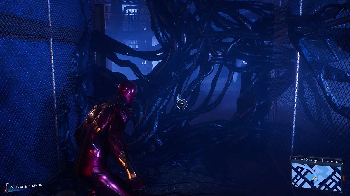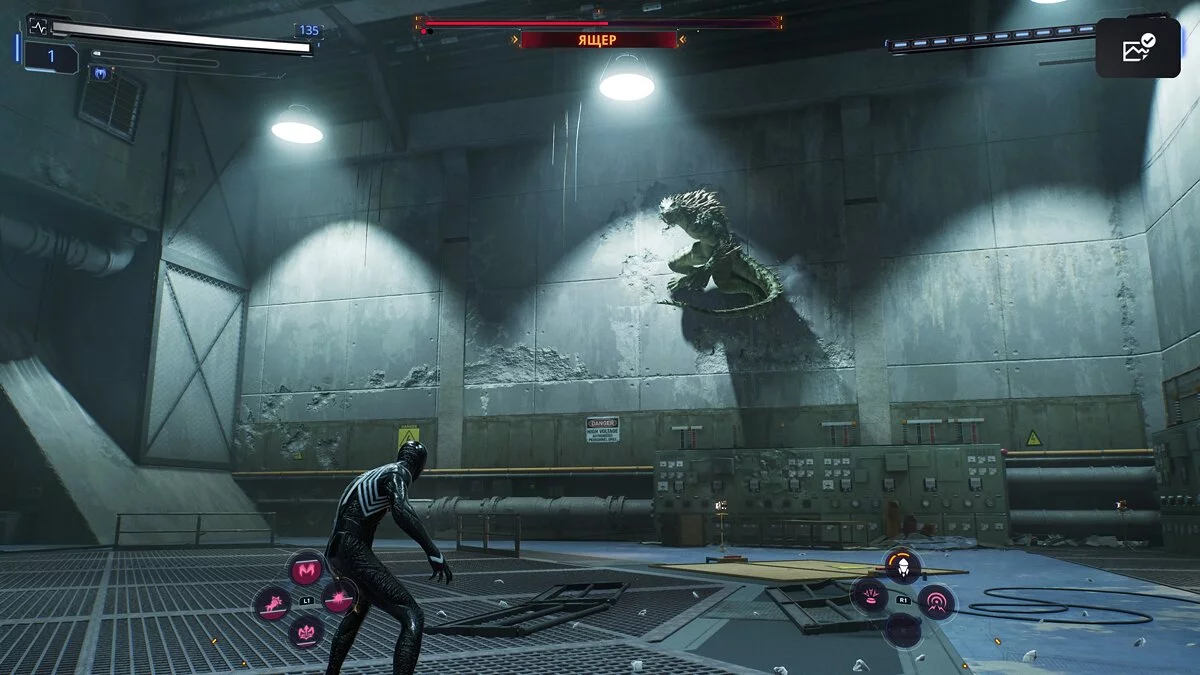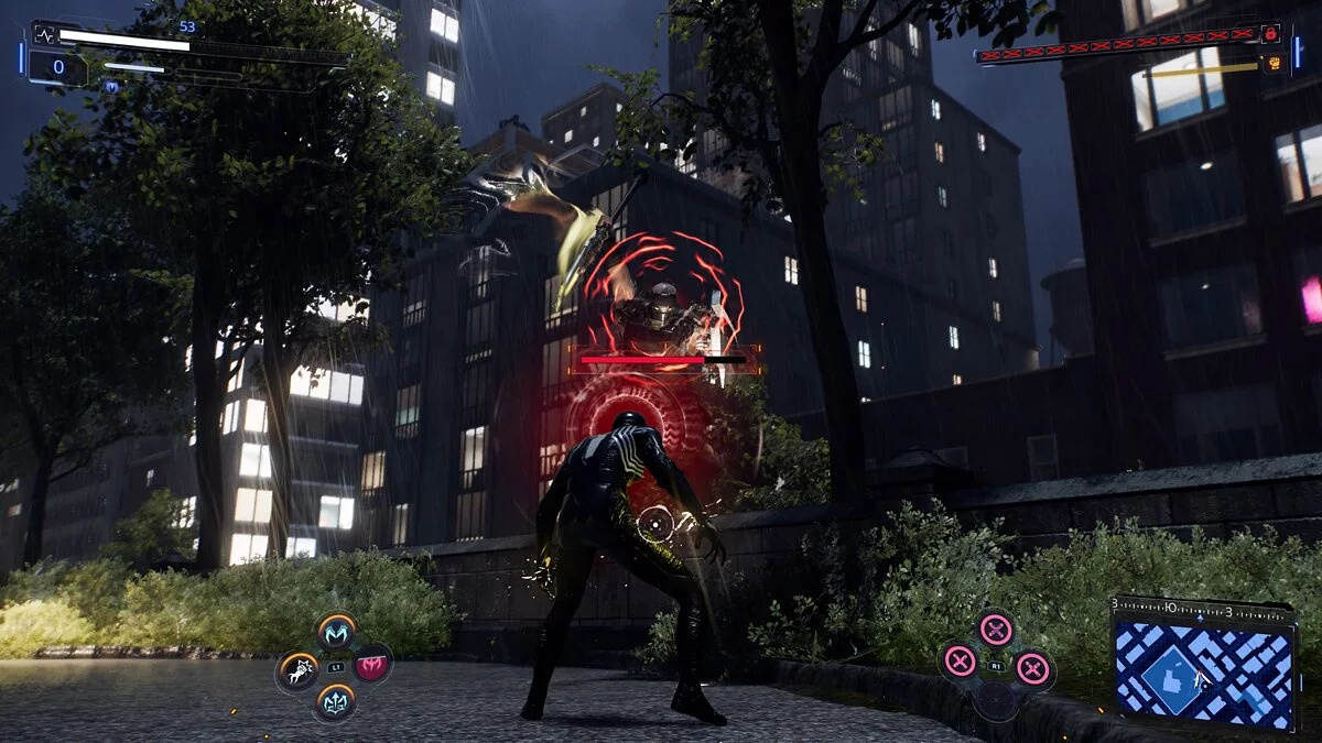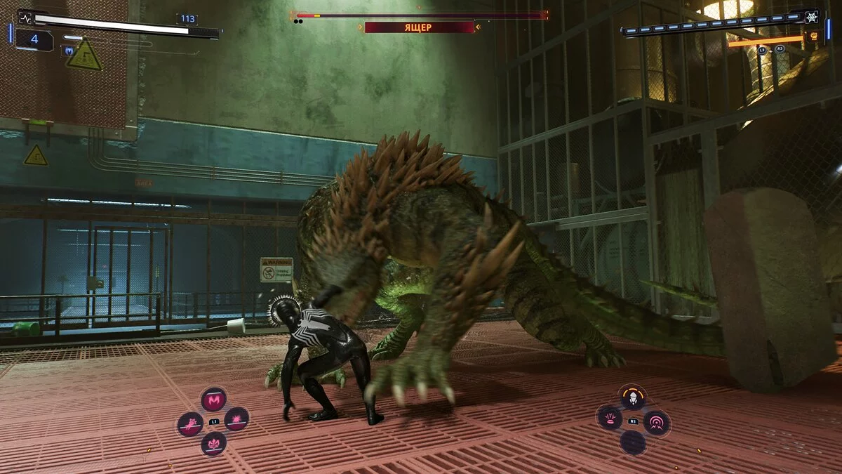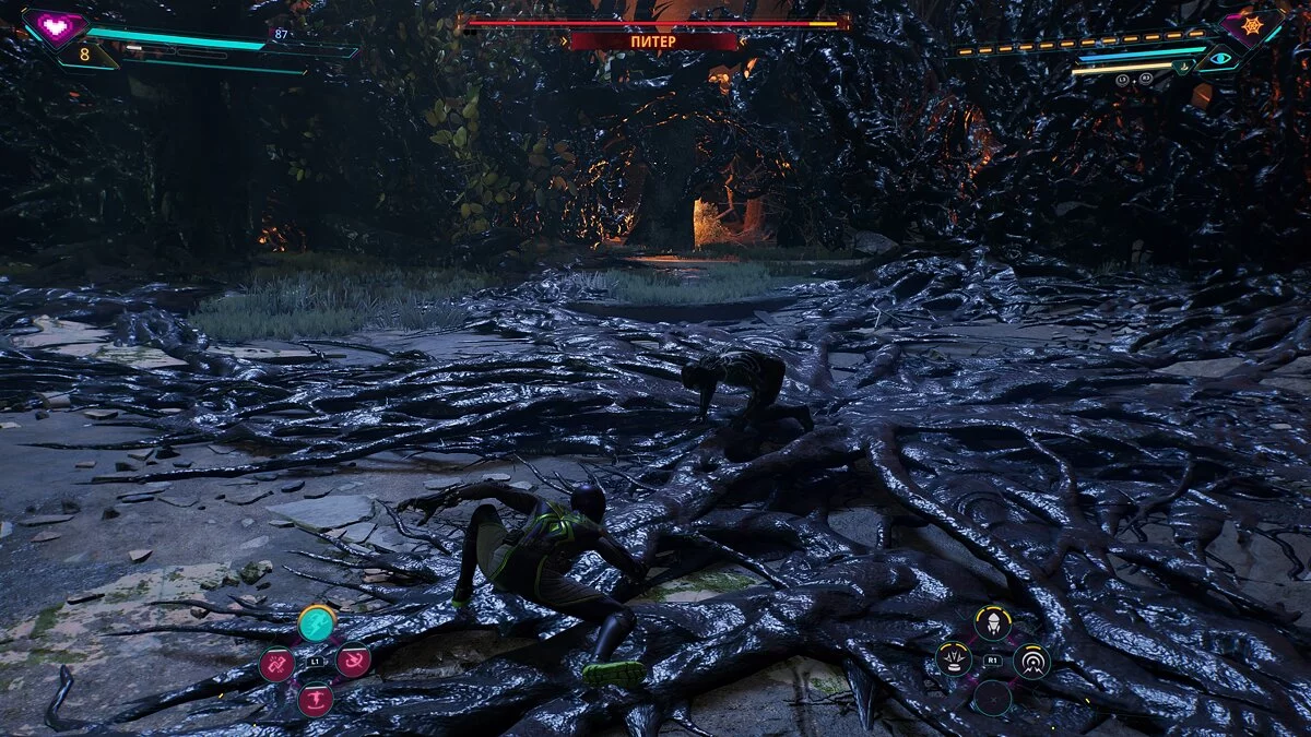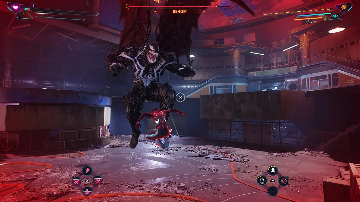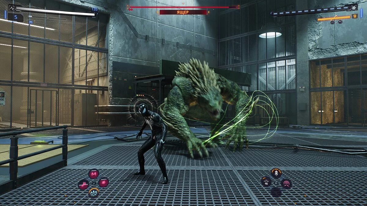 После сражений с рядовыми врагами на вас выбегут два симбиота-гиганта. В бою с ними полагайтесь, прежде всего, на умения антивенома, которые будут быстро перезаряжаться и не забывайте парировать атаки.