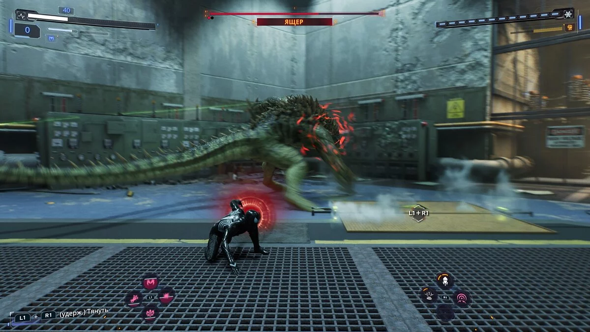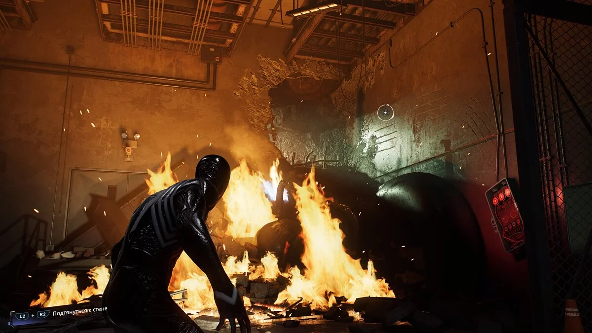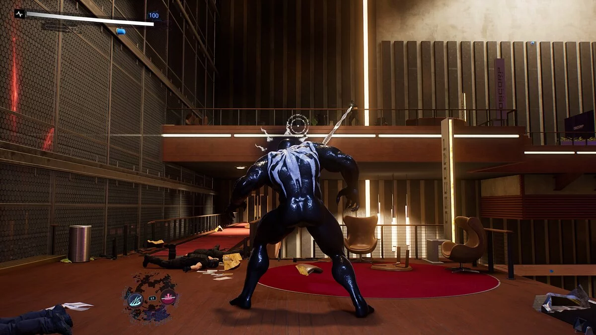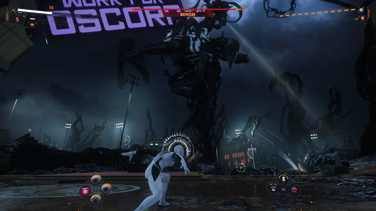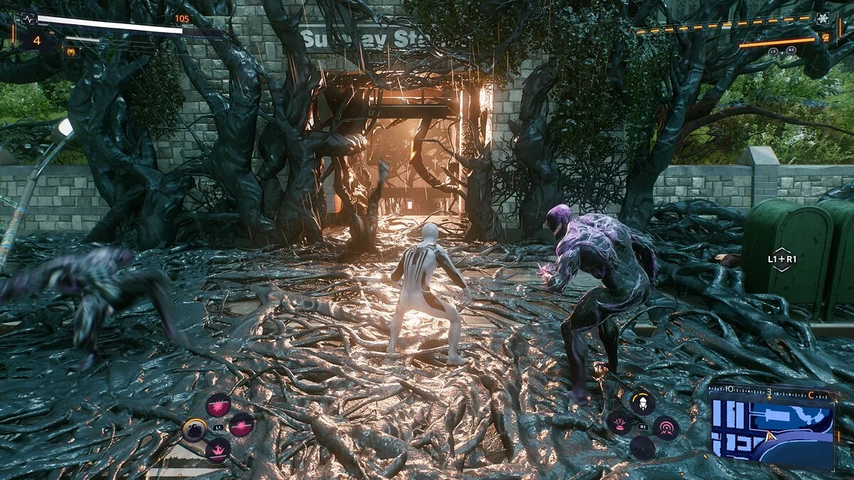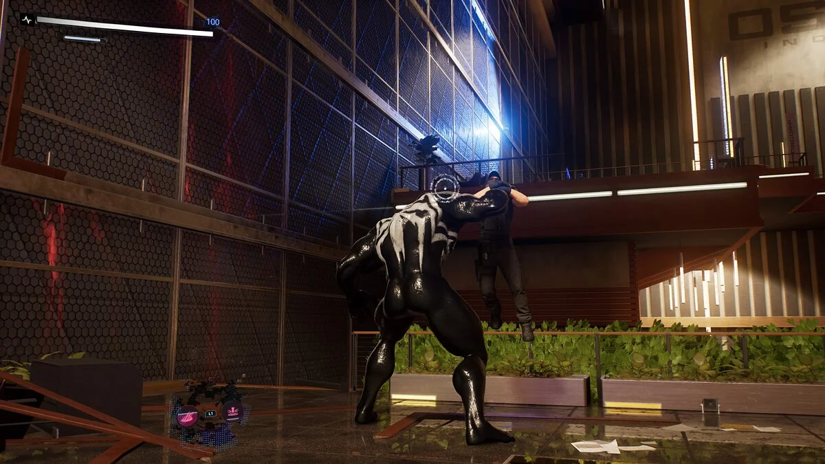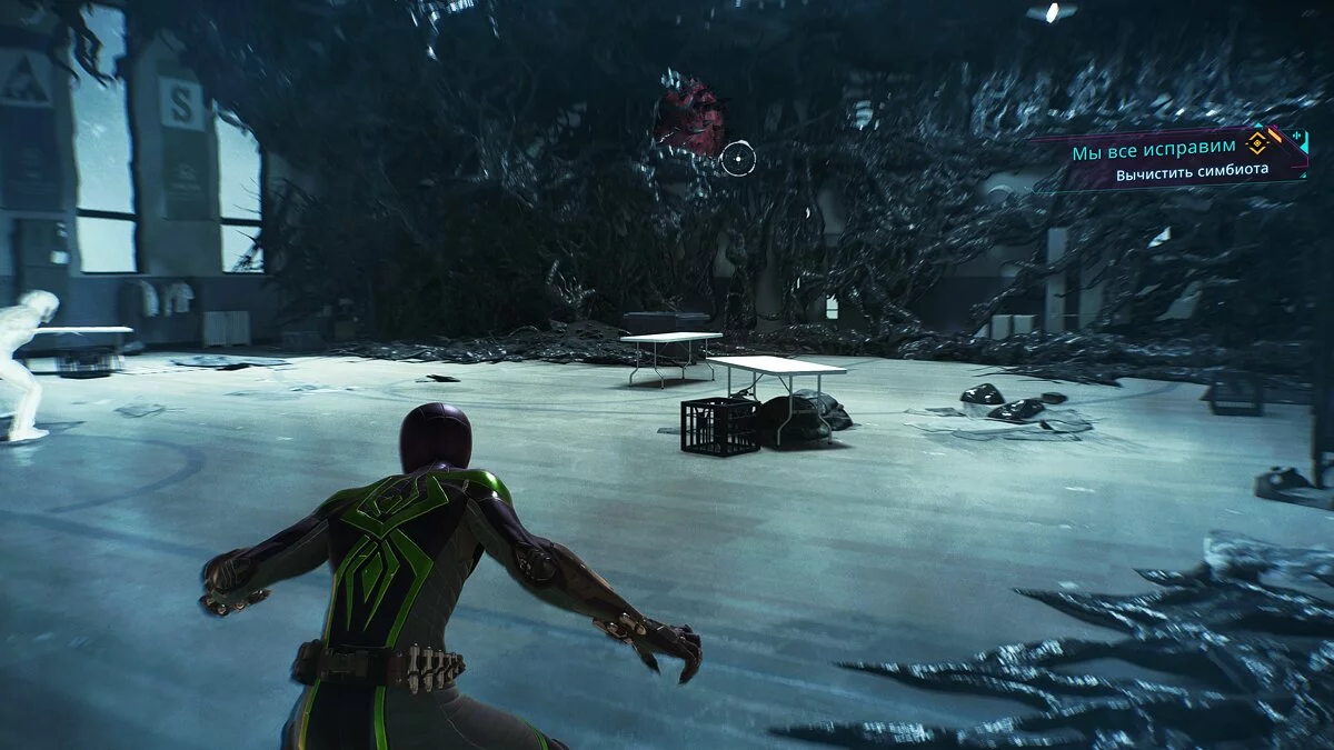 После сражений с рядовыми врагами на вас выбегут два симбиота-гиганта. В бою с ними полагайтесь, прежде всего, на умения антивенома, которые будут быстро перезаряжаться и не забывайте парировать атаки.