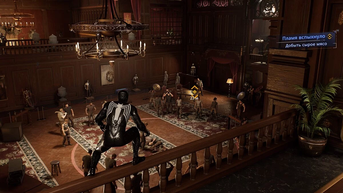 На рынке вырубить всех бесшумно будет непросто. Для этого важно следить за зоной видимости летающих дронов. Избавьтесь от них в первую очередь. Для борьбы с обычными бойцами используйте паутинную нить. При желании можно активировать газовые ловушки. Таким образом вы вырубите нескольких противников, но не вызовете тревогу.