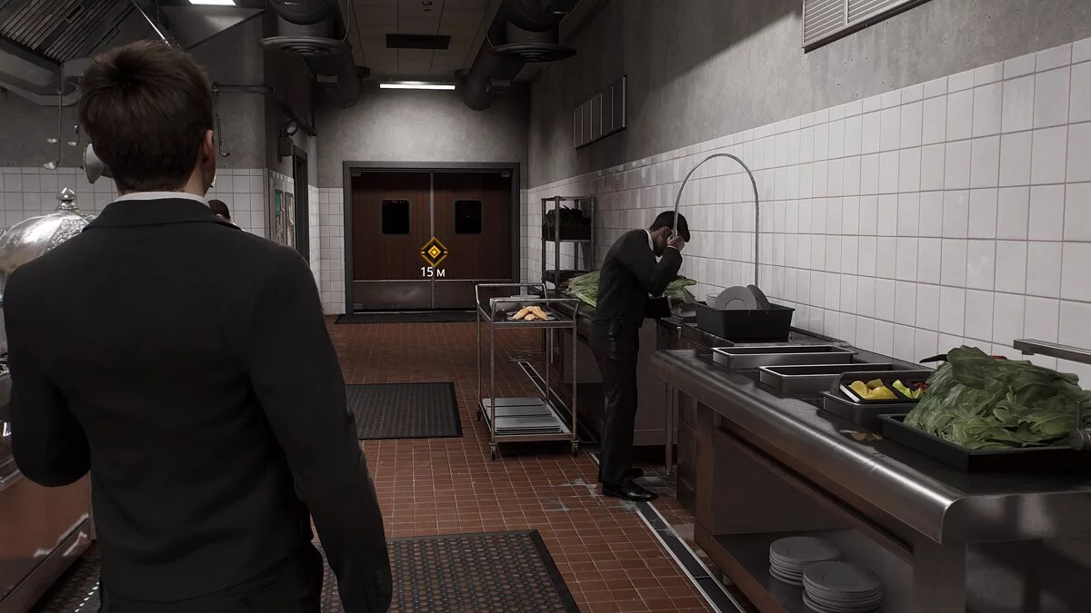 Прячьтесь за стендами, чтобы не попасться на глаза охраннику. Подождите, пока Питер скажет «Путь свободен. Вперёд», после чего бегите к приоткрытой двери напротив.