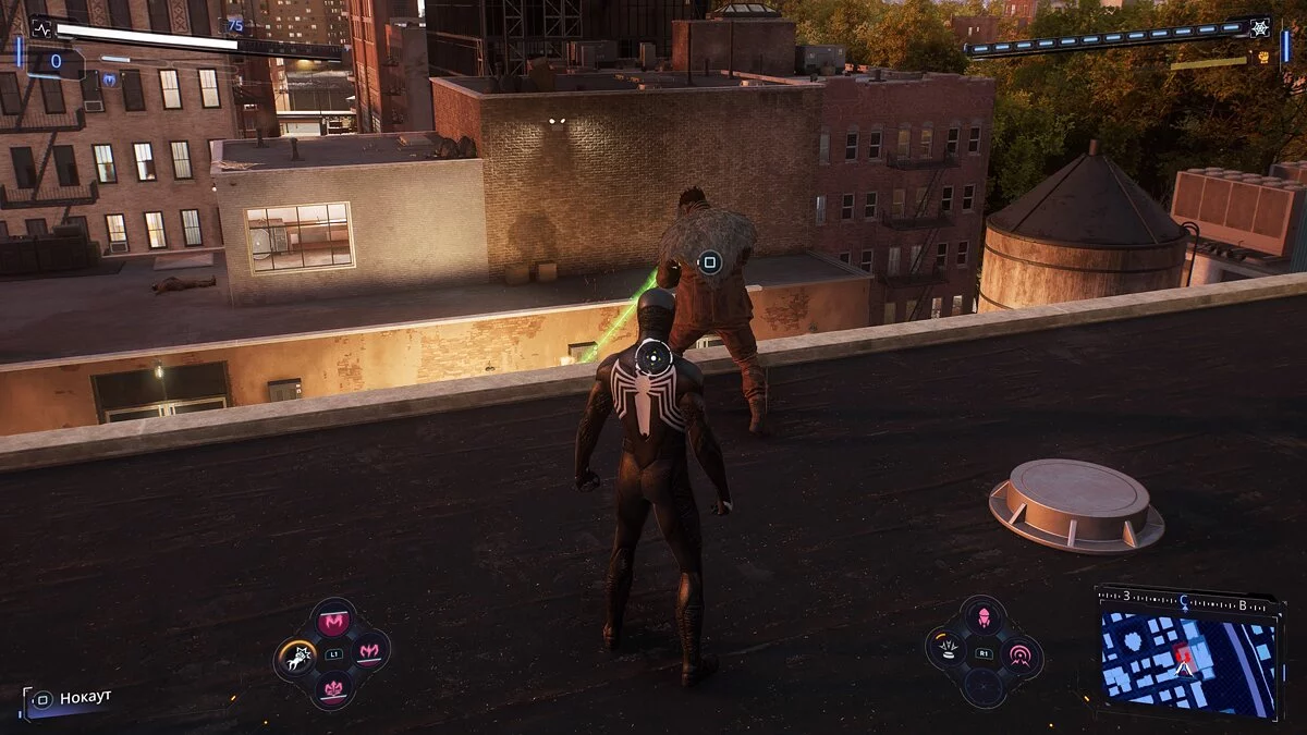 Играем за Майлза. Вам нужно одолеть Питера, который стал Веномом. Теперь наоборот нужно бить в колокол, чтобы оглушить противника. В этом случае появится возможность провести серию ударов. Можете попробовать окутать босса паутиной. Для этого важно, чтобы все выстрелы попали в цель.