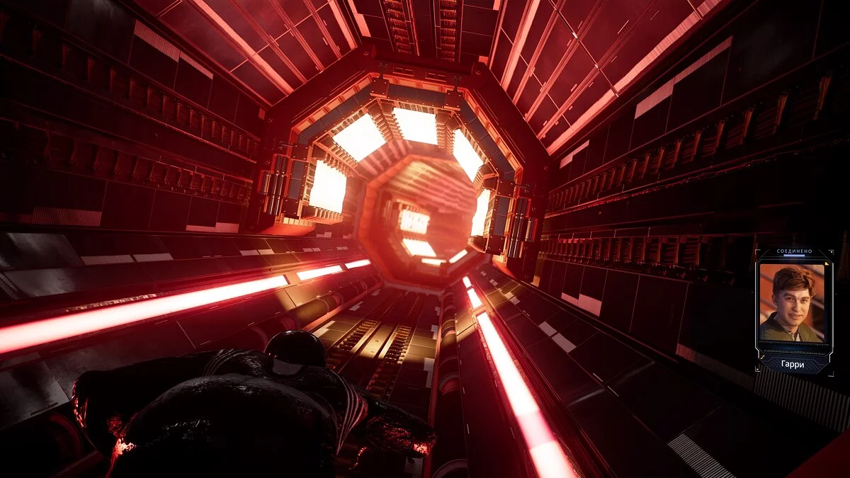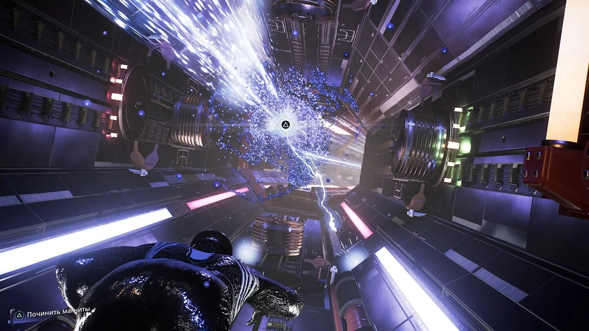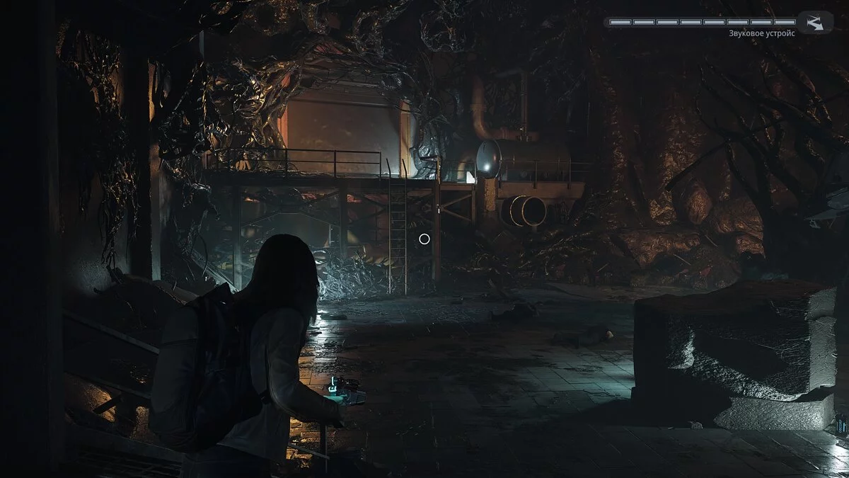 Однако этот источник звука слишком слабый, чтобы оглушить симбиота. Спускайтесь на палубу катера и взаимодействуйте с двигателем.