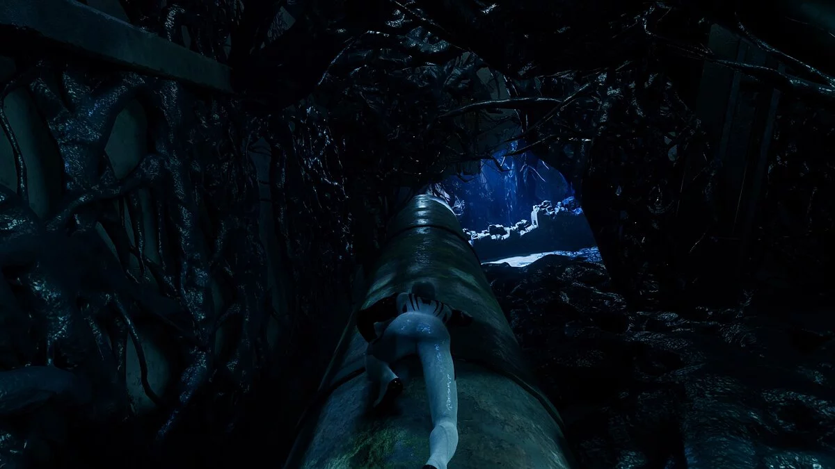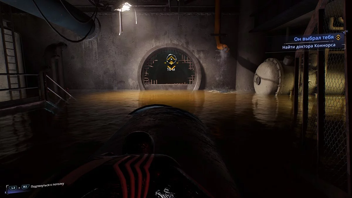 После этого вы окажетесь под водой. Чтобы двигаться вперёд, используйте прыжки с использованием паутины (L2+R2).