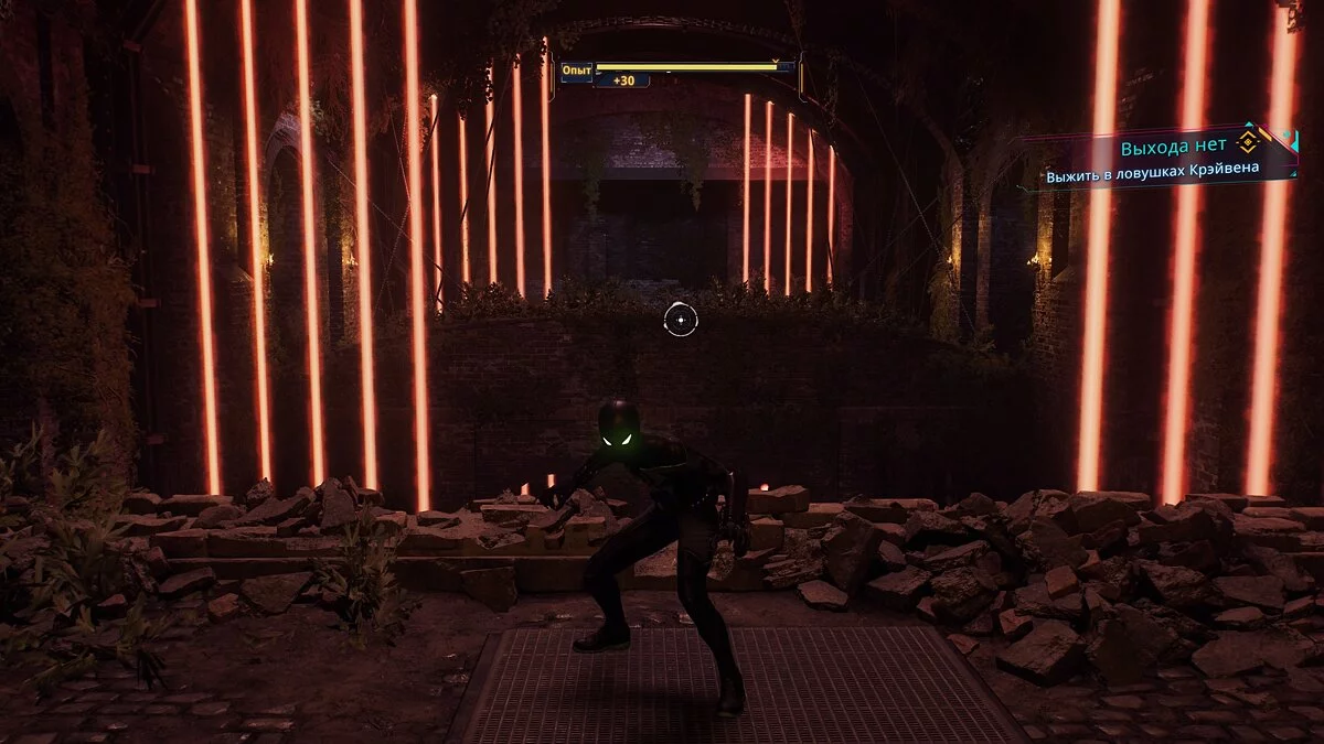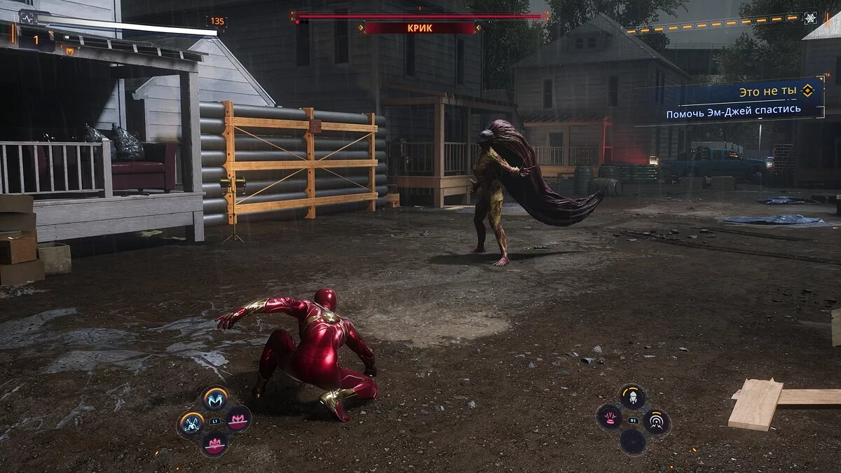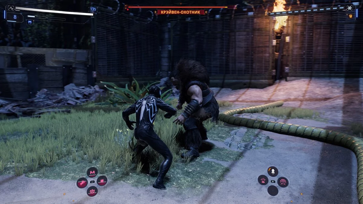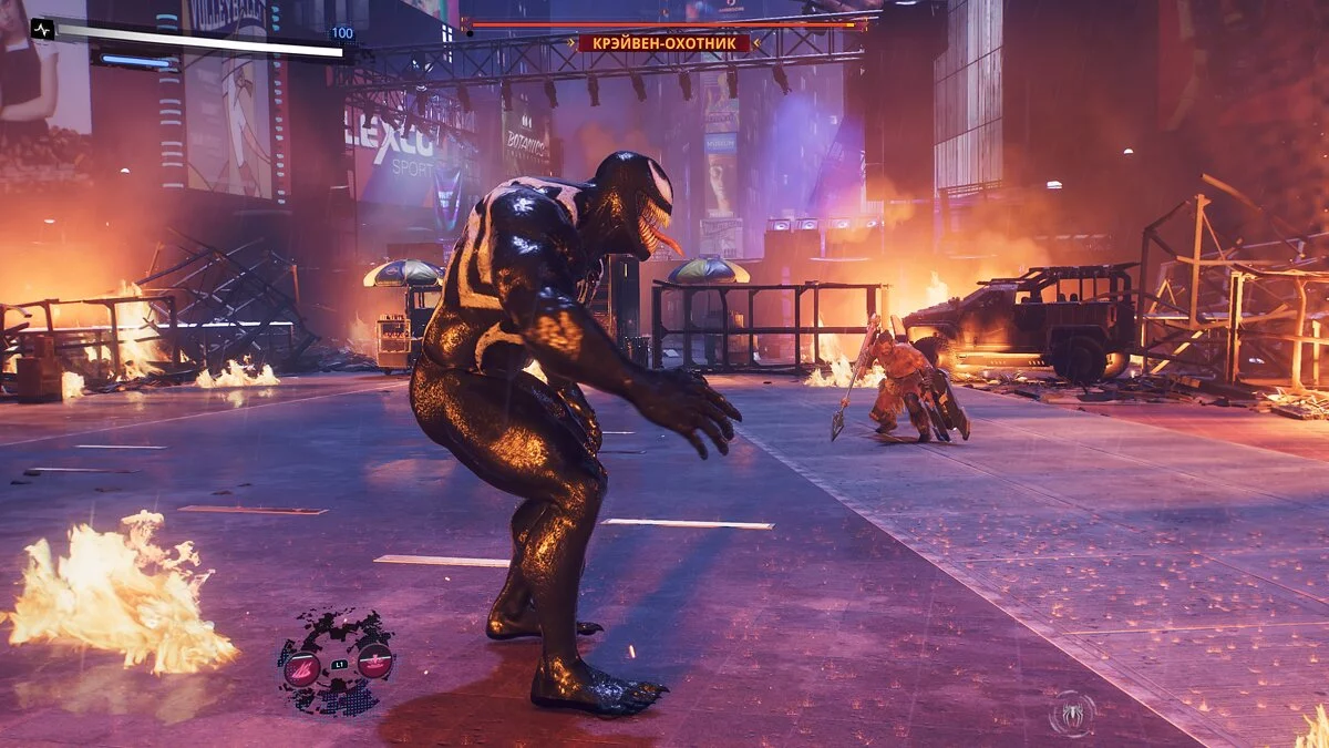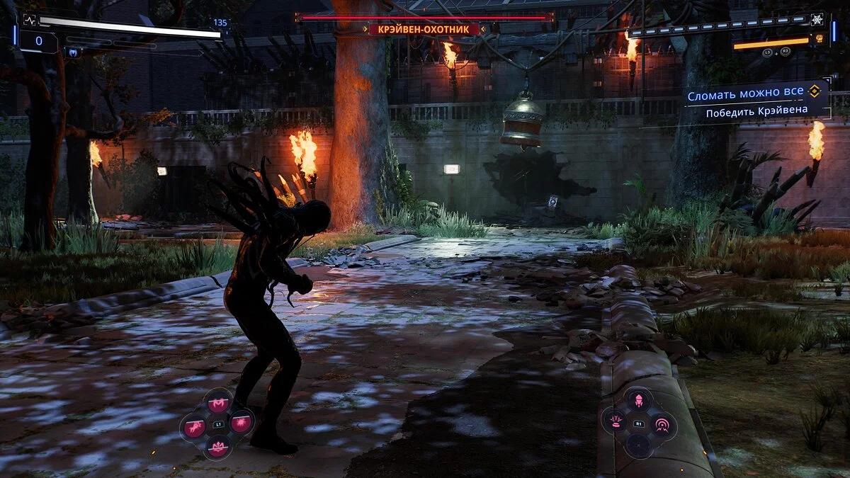 Выстрелы паутиной позволят обездвижить его на пару секунд, что обеспечит вам преимущество. Гаджеты практически бесполезны, а сверхспособности могут нанести большой урон. Когда босс бросит бомбы — бегите вперёд. Так проще всего избежать урона. После броска дымовой шашки сразу уклоняйтесь, ведь в вас полетит копьё. Также обращайте внимание на предметы, которые разбросаны по арене. С их помощью можно нанести дополнительный урон Крэйвену. Не забывайте проводить добивания, когда появится возможность.