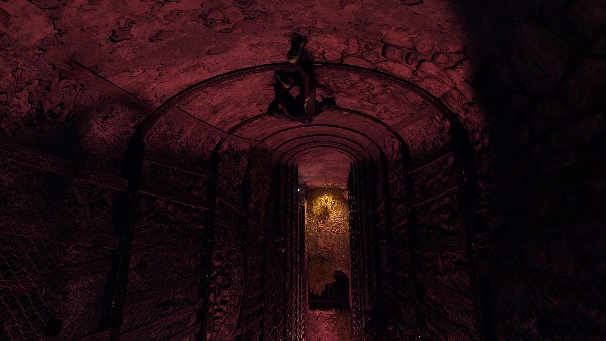 Идите вперёд, мимо клеток с пленниками. Когда дойдёте до тупика — прыгайте на потолок, проползите над решёткой и спускайтесь вниз.