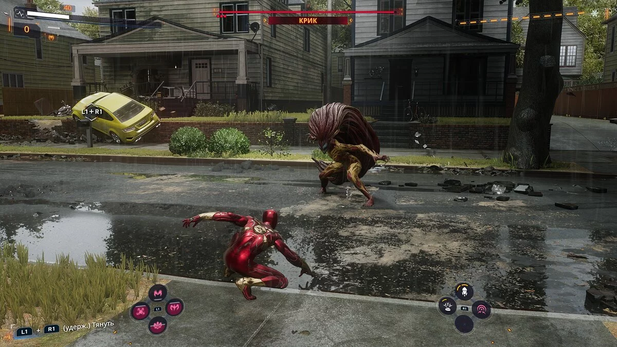 Вскоре начнётся первое сражение в игре. Бейте врагов кулаками («квадрат») и мощными паутинными ударами («треугольник»). Когда над головой вашего героя появится белый значок — нужно уклониться в сторону при помощи кнопки «кружок».
