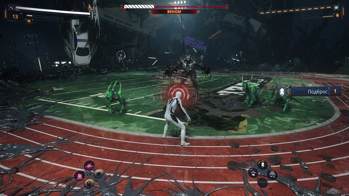 Также вам помогут различные предметы на арене, которые могут оглушить босса. Если у вас получилось ошеломить Венома — бейте его кулаками. Периодически монстр будет заражать землю чёрной жидкостью. В этот момент важно подпрыгнуть вверх и переместиться на чистый участок.