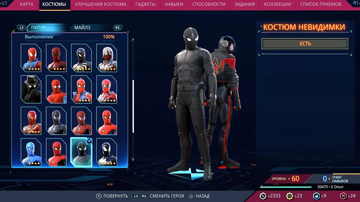 В отличие от предыдущей игры, костюмы лишены каких-то особенных свойств. Теперь это не более, чем косметические изменения. В меню вы найдете отдельный раздел «Улучшения костюма», где можно прокачать здоровье, урон, концентрацию и перемещение. Все апгрейды одинаково работают на любом из выбранных нарядов и распространяются как на Питера, так и на Майлза.