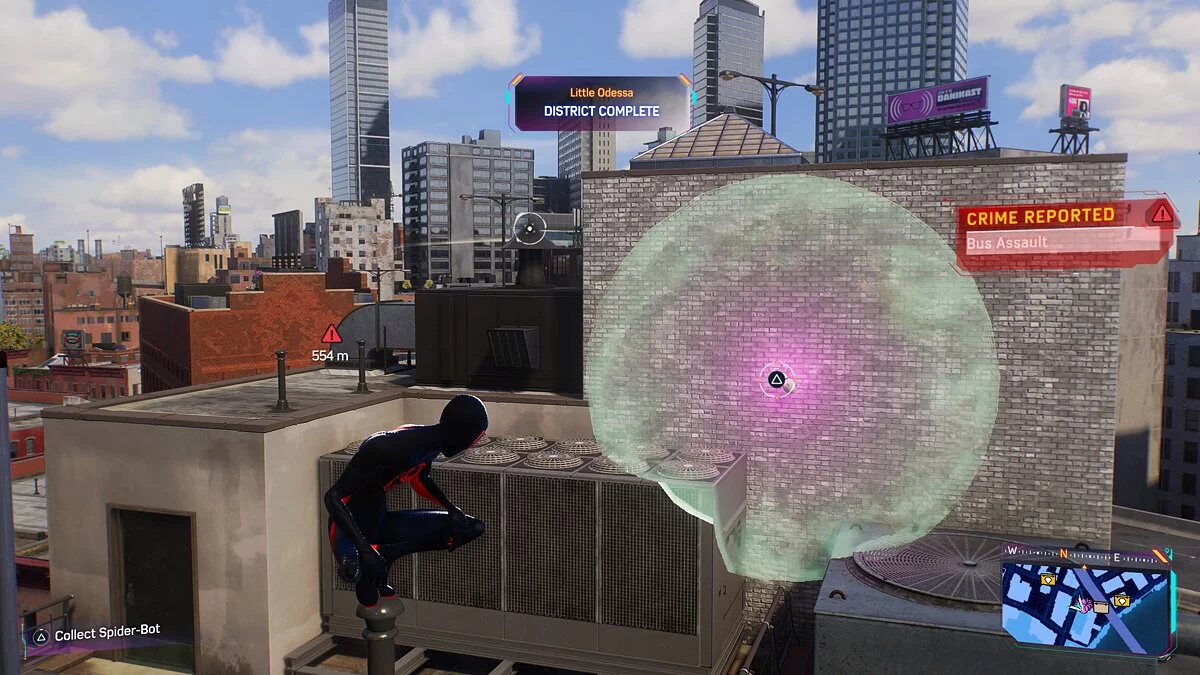 Всего в игре 42 бота, разбросанных в разных концах Нью-Йорка. Хорошая новость в том, что, открыв карту, вы всегда сможете увидеть, сколько их в конкретном районе и сколько вы уже нашли. В награду вы будете получать 150 опыта и 100 деталей за каждого. Это задание — отсылка на мультфильмы про Майлза Моралеса, но об этом вы узнаете лишь в конце.
