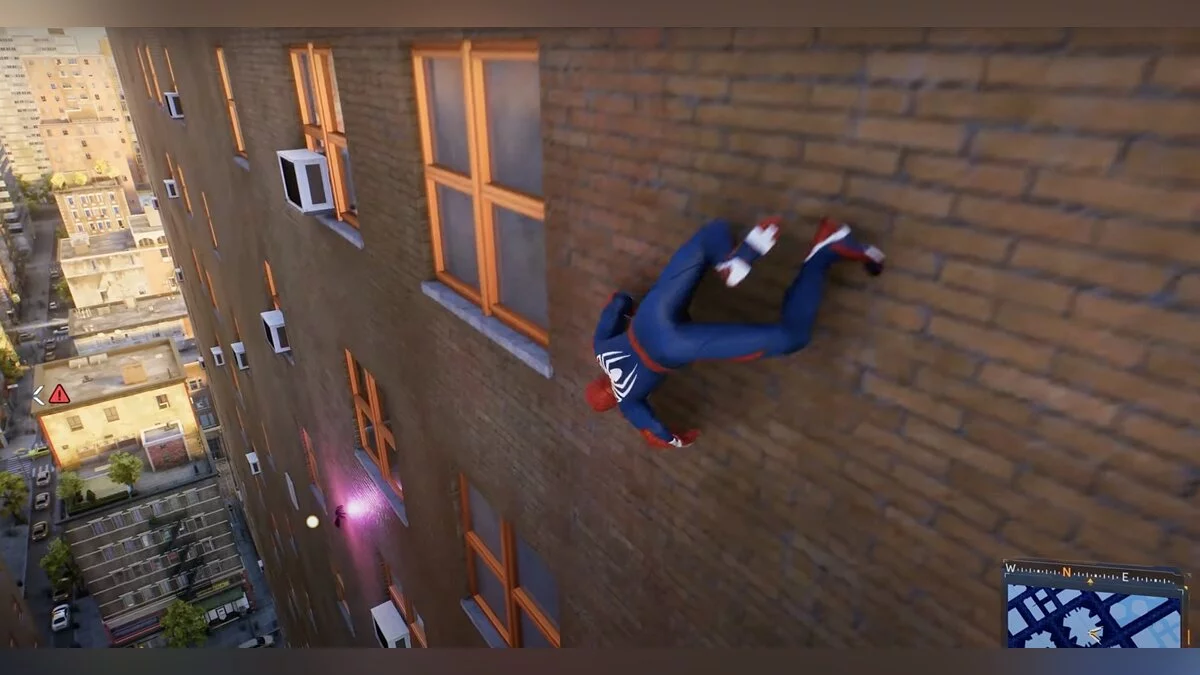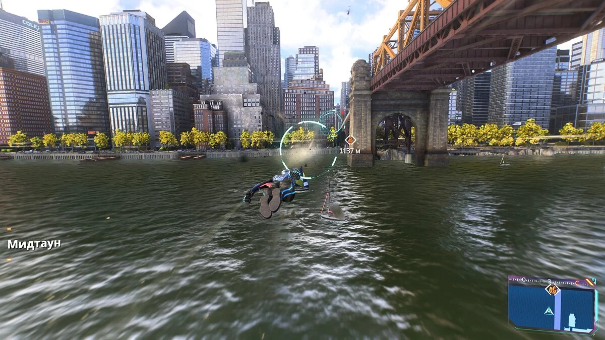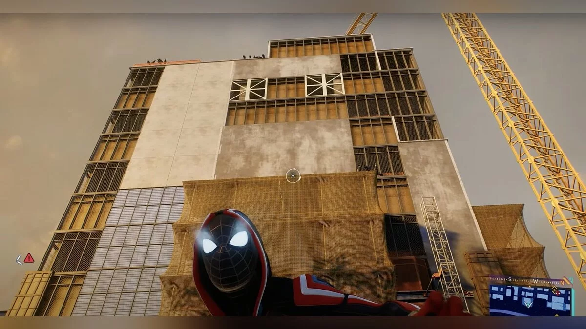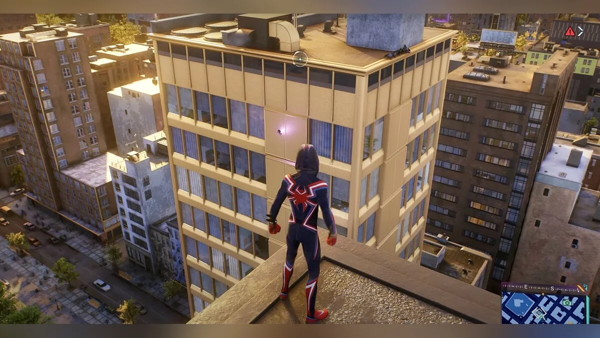 В этом же районе спуститесь вниз — на юг. Паукобот завис в воздухе над небоскребами, поэтому найдите самое высокое здание и начните планировать на крыльях. Вы сразу его увидите.