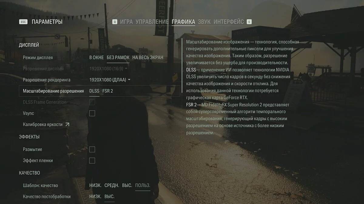Первым делом стоит обратить внимание на опциональное масштабирование изображения. У пользователей RTX видеокарт это вкладки: DLSS и FSR 2. У владельцев RX и GTX — только FSR 2.