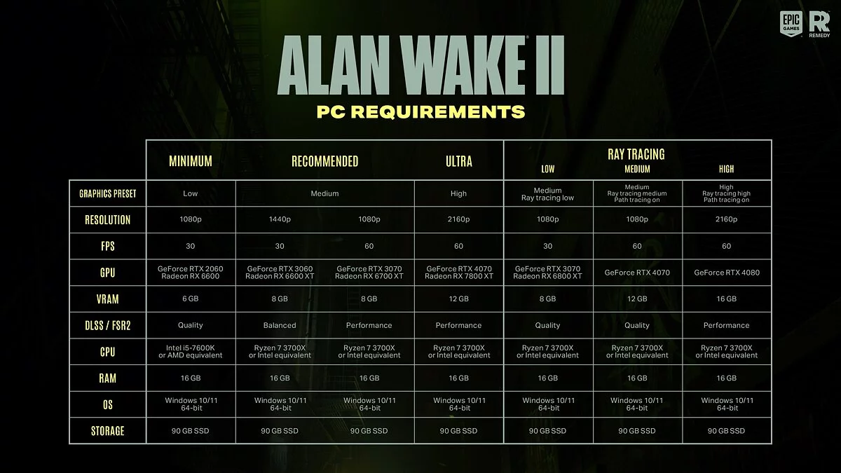 Разработчики Alan Wake 2 выложили в открытый доступ таблицу с рекомендуемым железом для комфортного геймплея. Минимальным порогом к стабильным 30 кадрам стала конфигурация: RTX 2060 или RX 6600, Intel i5 7600K или схожий по частотам процессор от AMD, 6 ГБ оперативной памяти и SSD-накопитель. Да, игра очень «прожорливая» на ресурсы, поэтому хорошие FPS на видеокартах GTX без танцев с бубном вы не получите.