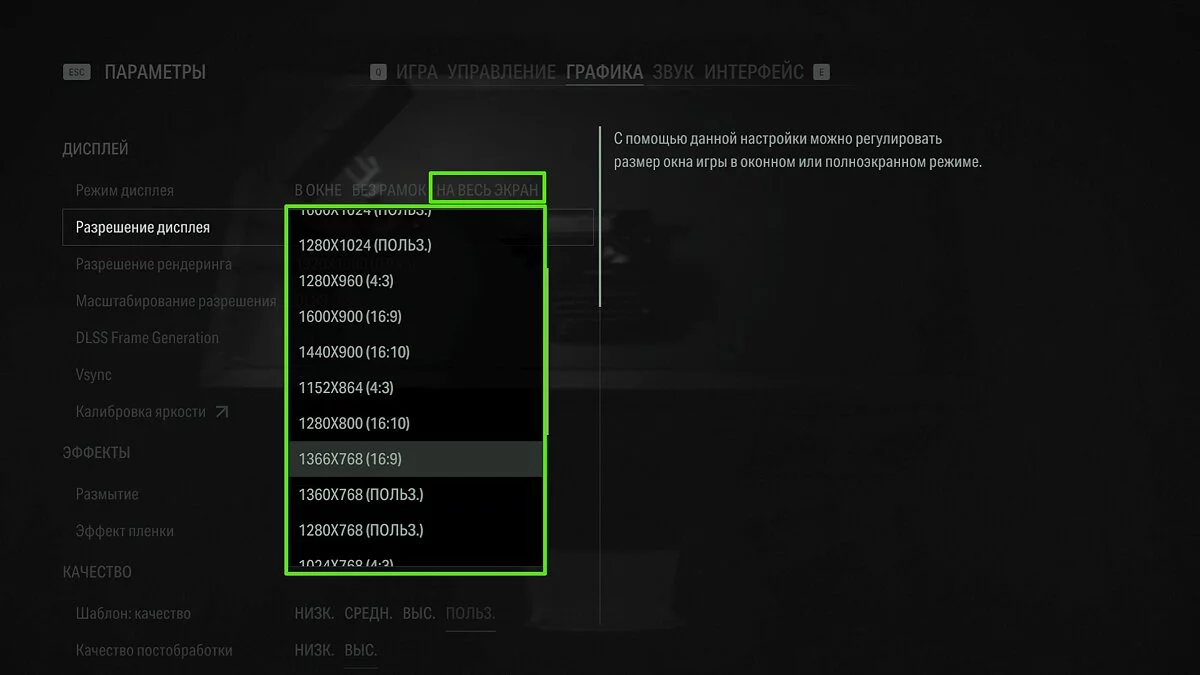 Уменьшение разрешения в игре повлияет на общую картинку, однако это также поможет справиться с ошибкой. Вместе с изменением снизится объём требуемой видеопамяти.
