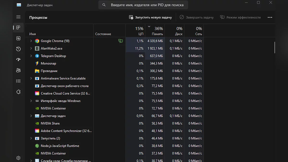 Перед запуском Alan Wake 2 отключите все приложения для мониторинга в играх, а также завершите процессы сторонних и фоновых приложений: