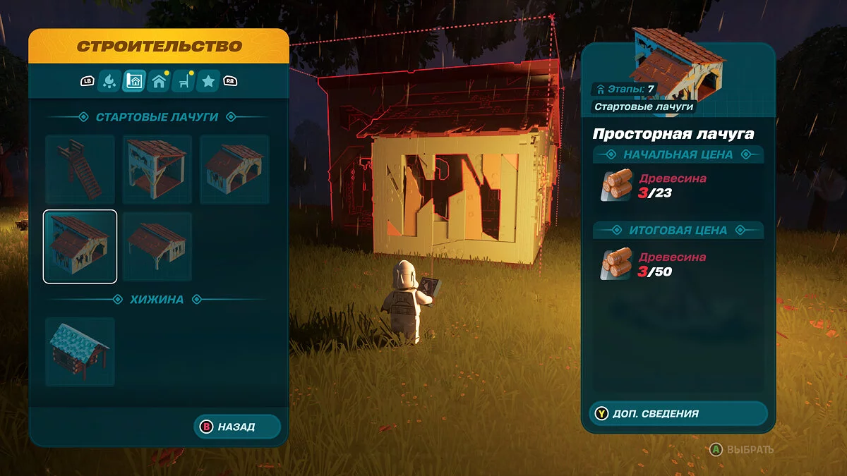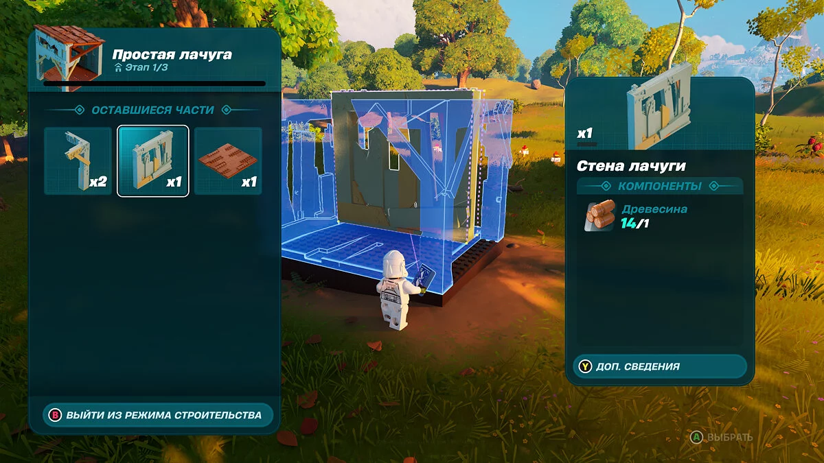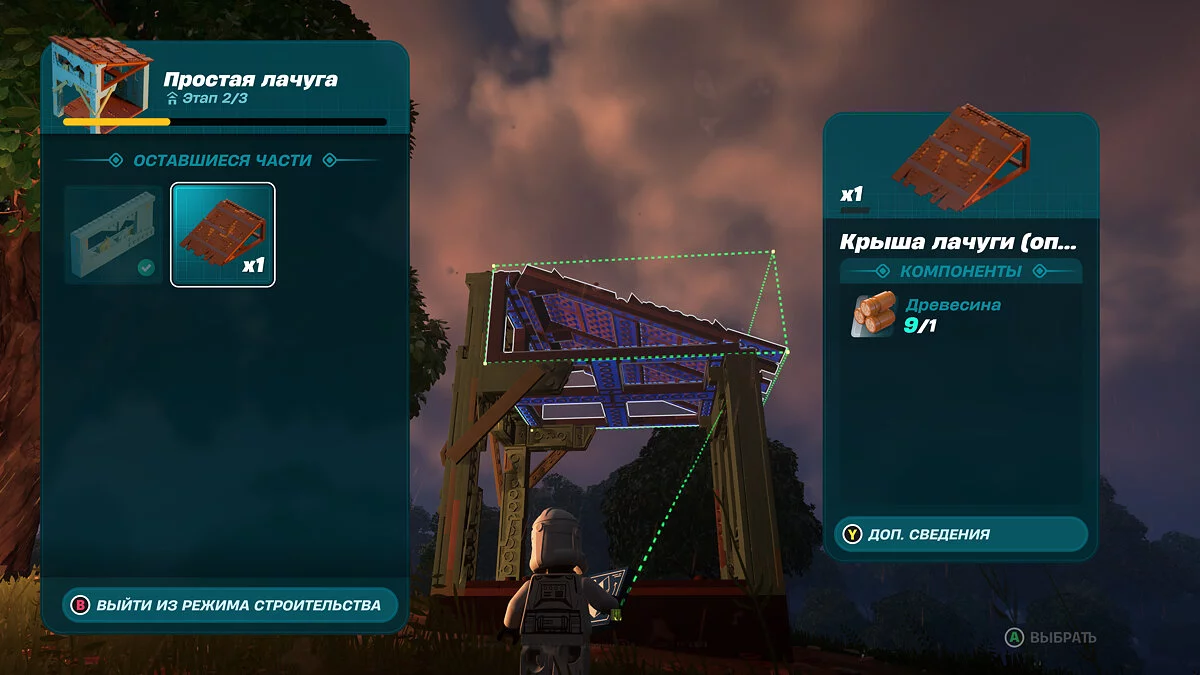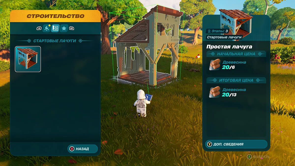 Когда вы выбираете каждую дополнительную часть в меню сборки, она аккуратно встает на место в возникающей постройке. Начните с простой лачуги, состоящей из 3 этапов. В чертеже указаны начальный и итоговый список ресурсов.
