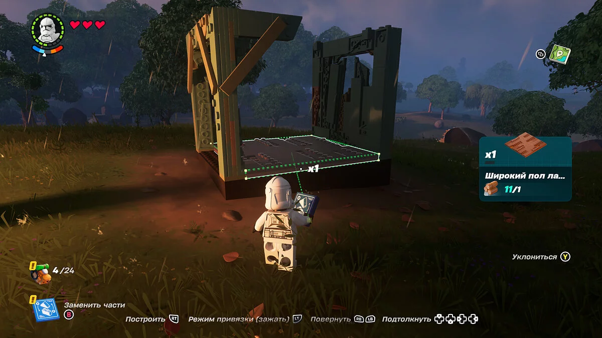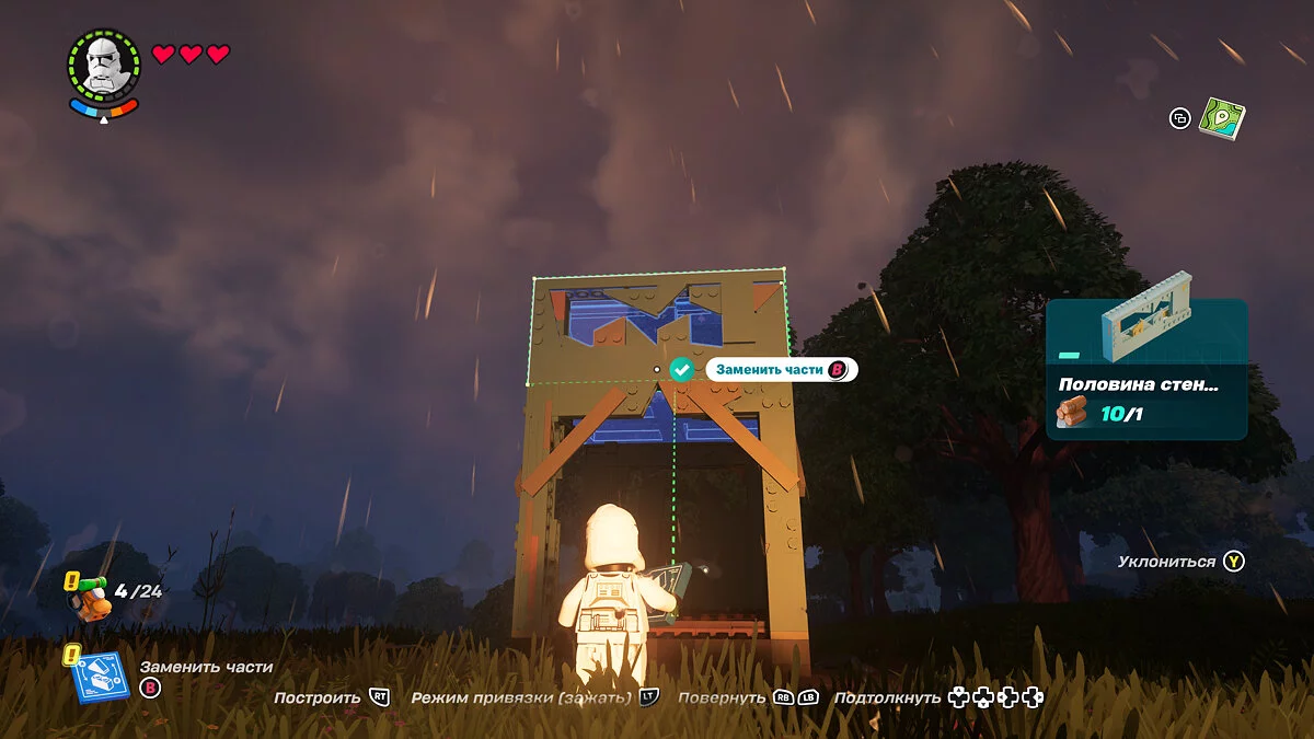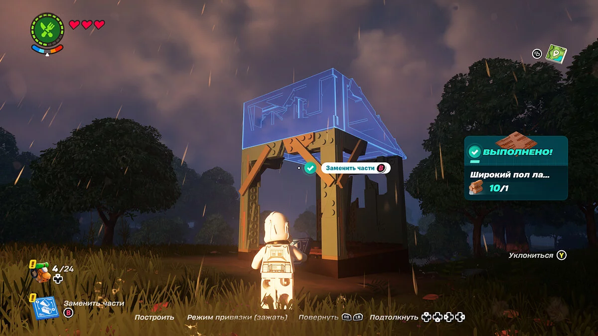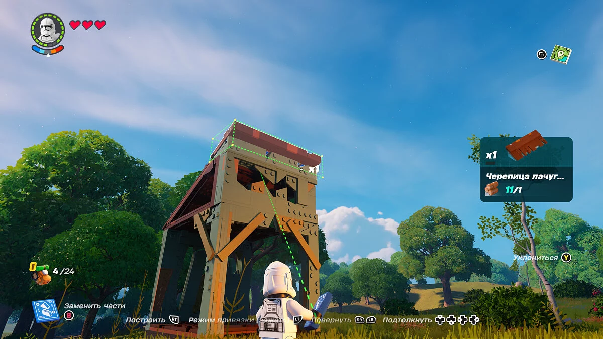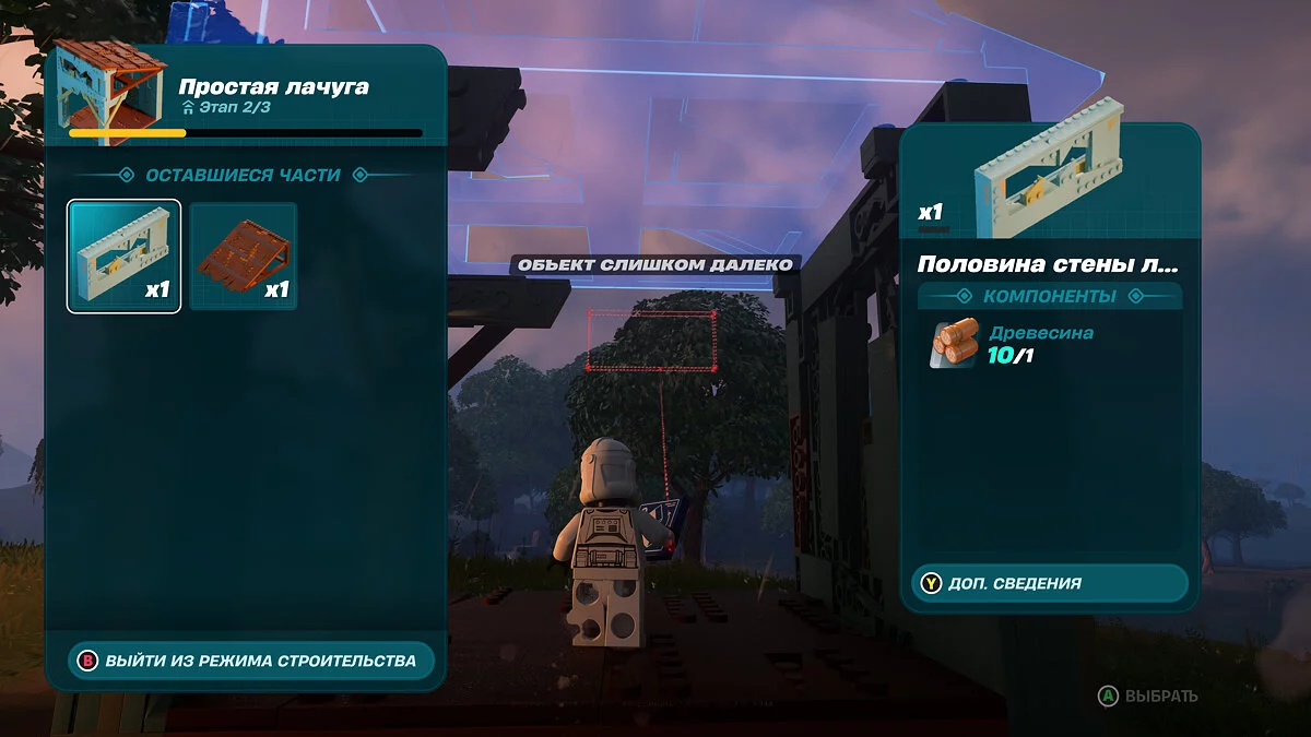 Когда вы выбираете каждую дополнительную часть в меню сборки, она аккуратно встает на место в возникающей постройке. Начните с простой лачуги, состоящей из 3 этапов. В чертеже указаны начальный и итоговый список ресурсов.