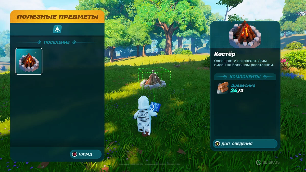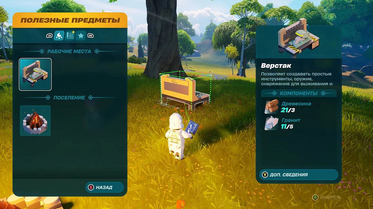 Как только вы соберете достаточно материалов, откройте меню строительства, нажав кнопку B. Здесь вы найдете список предметов, разделенный на категории, такие как «Полезные предметы» или «Мебель». Выберите то, что вы хотите создать, и появится проект.