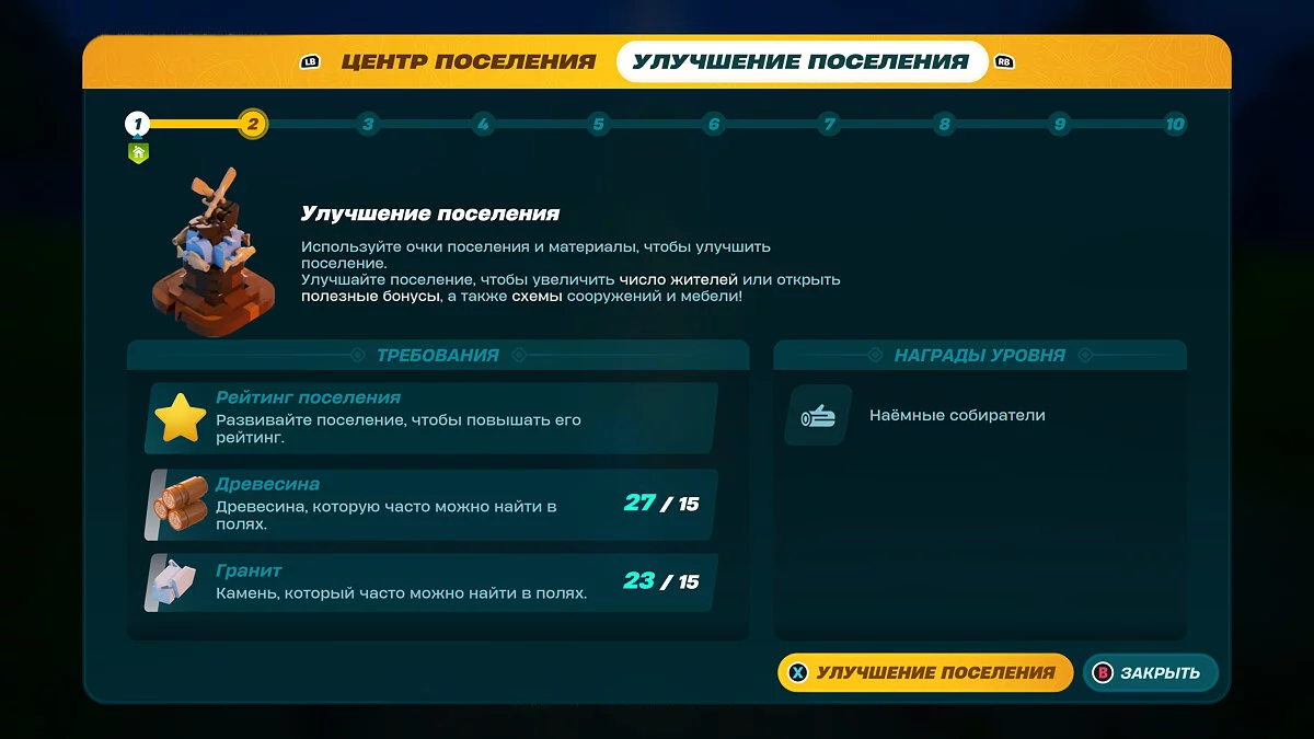 Повышение уровня вашего поселения дает вам награды. Это новые функции для деревни, такие как возможность добавлять новых жителей, нанимать работников или привлекать более редких посетителей. Вы можете увидеть награды за повышение уровня, посетив вкладку центра поселения.