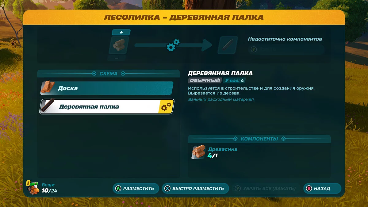 Дальше нужна лесопилка, для ее создания требуется пять единиц древесины и 15 единиц гранита. Теперь пришло время сделать лопату. Для этого требуются три деревянных палки и одна доска.