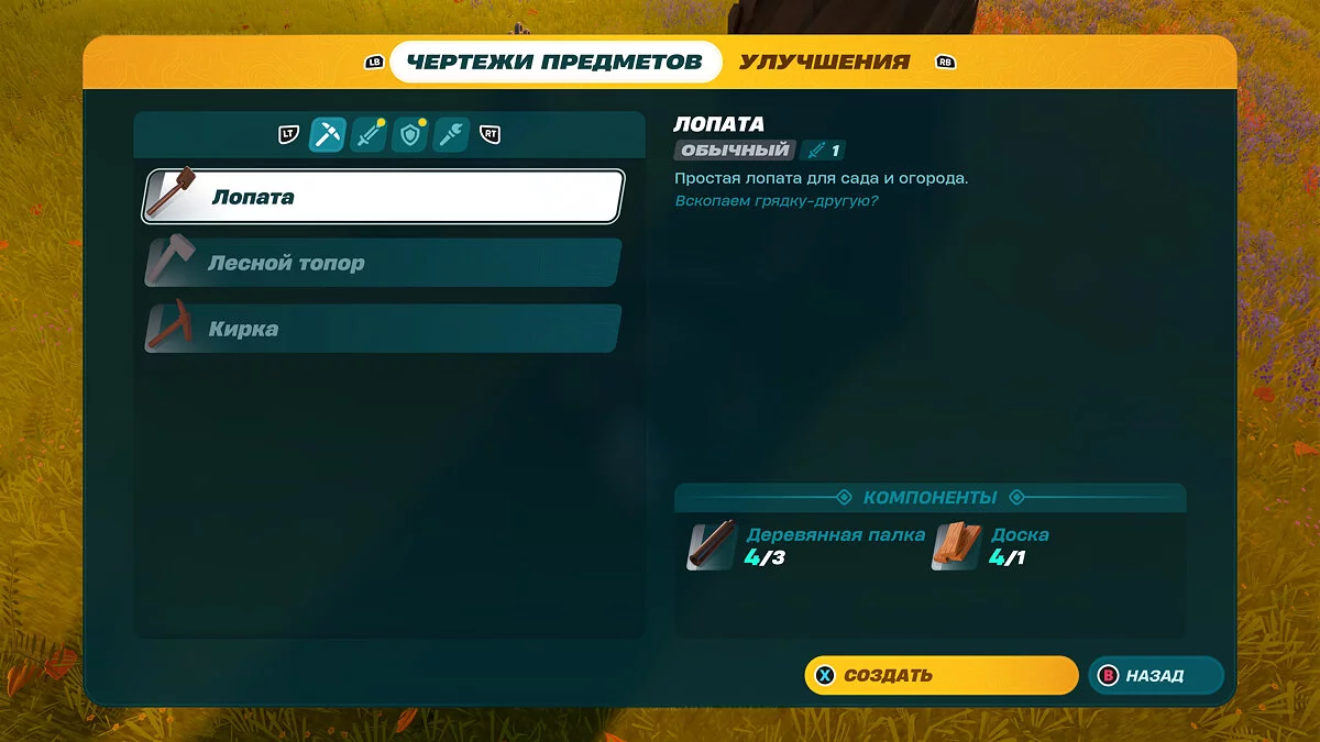 Далее вам понадобится садовый участок, на котором можно вырастить семена. Рецепт «Садовый участок» будет добавлен при изготовлении Лопаты. Для создания одной плитки нужны два грунта и одно удобрение.