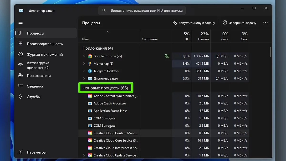 Например, если вы пользуетесь браузером Chrome, даже после закрытия приложения он оставляет действующие фоновые процессы, использующие ресурсы ПК. В последних версиях Windows 10 и Windows 11 отследить фоновые процессы стало проще в Диспетчере задач (Ctrl+Shift+Esc).