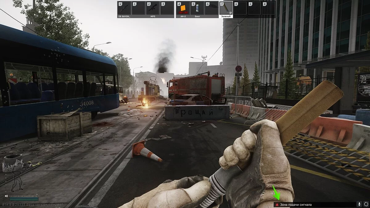 Один из самых безопасных выходов на карте «Эпицентр», однако перед тем, как бежать сюда, нужно знать несколько нюансов. Предварительно необходимо отыскать зелёный фаер и запустить его в точке подачи сигнала. С этим не возникнет трудностей, ведь один такой предмет с шансом 100% появляется в трупе прямо перед выходом.