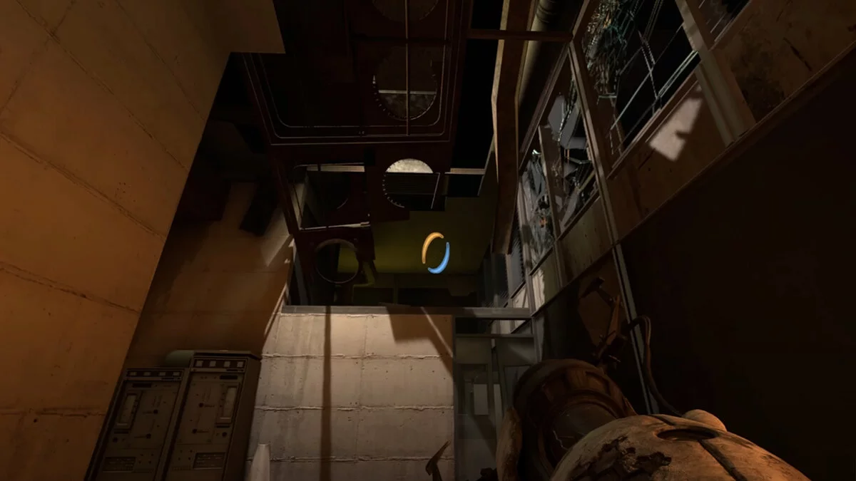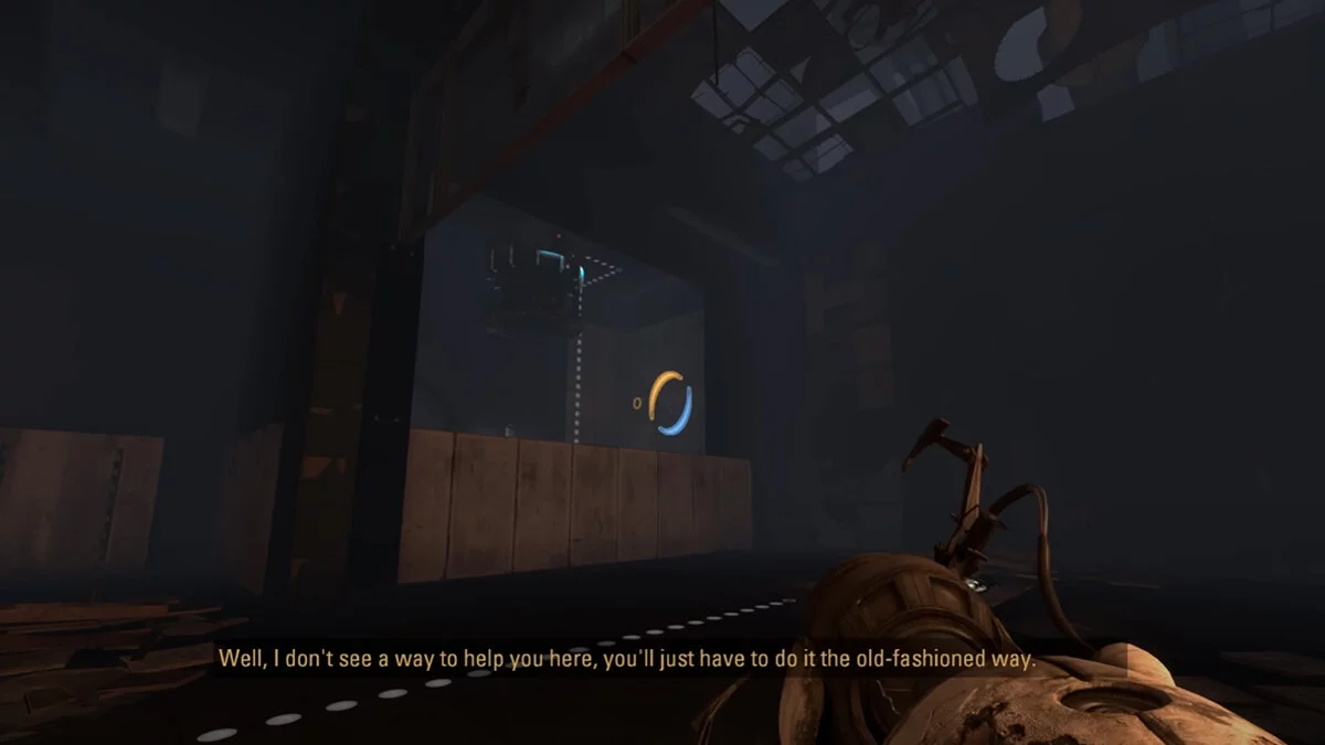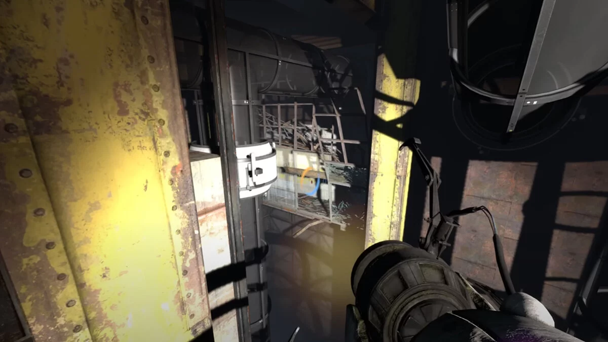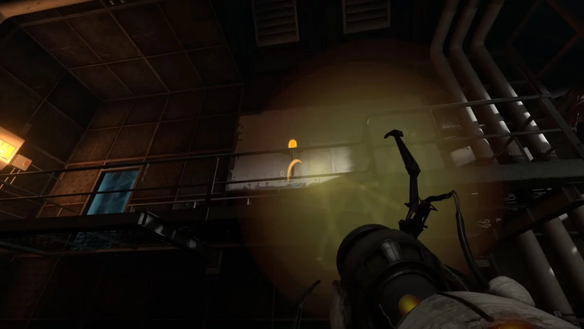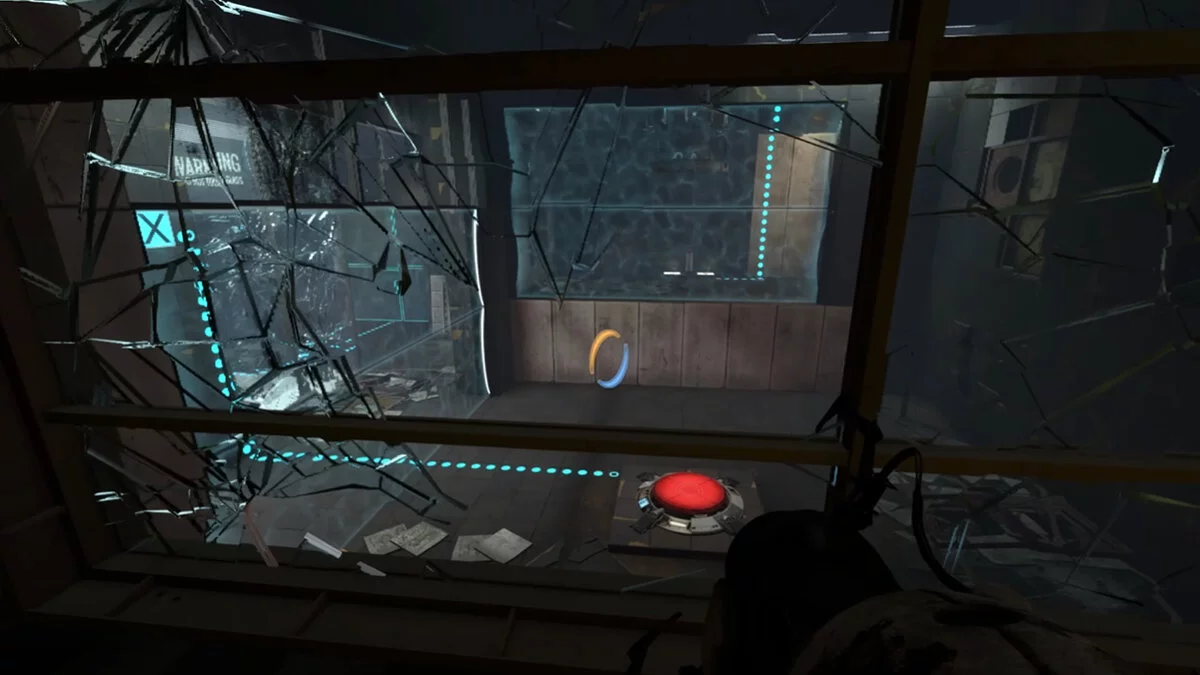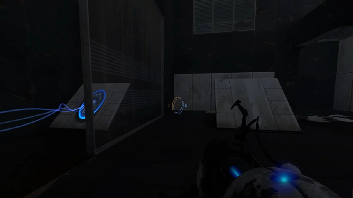 Открываем врата повыше, чтобы можно было обойти трубу. Следующий портал размещаем возле разбитых стёкол. В комнате, чуть дальше, спрыгиваем между перилами.