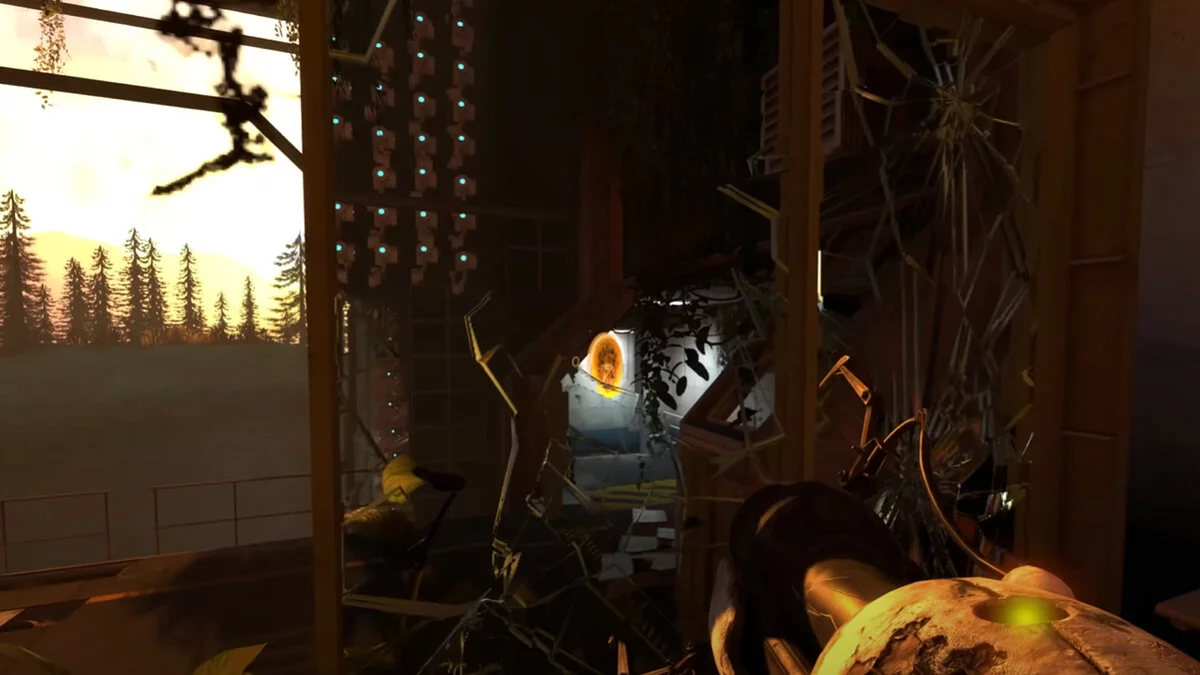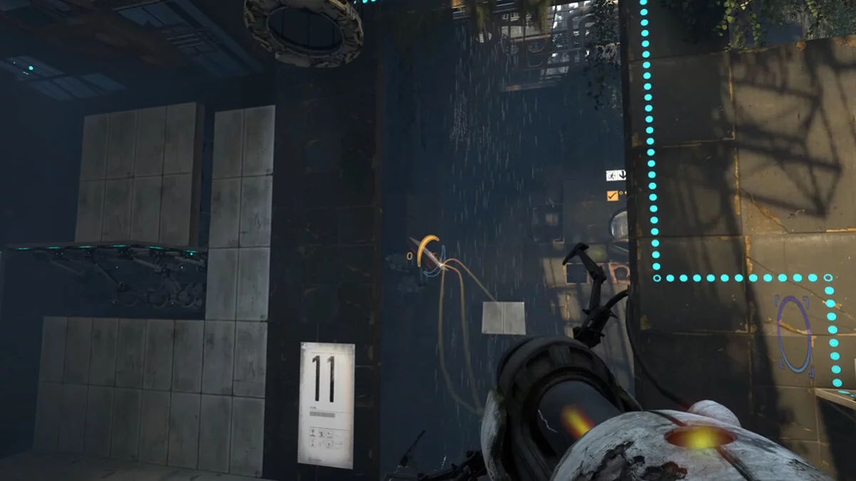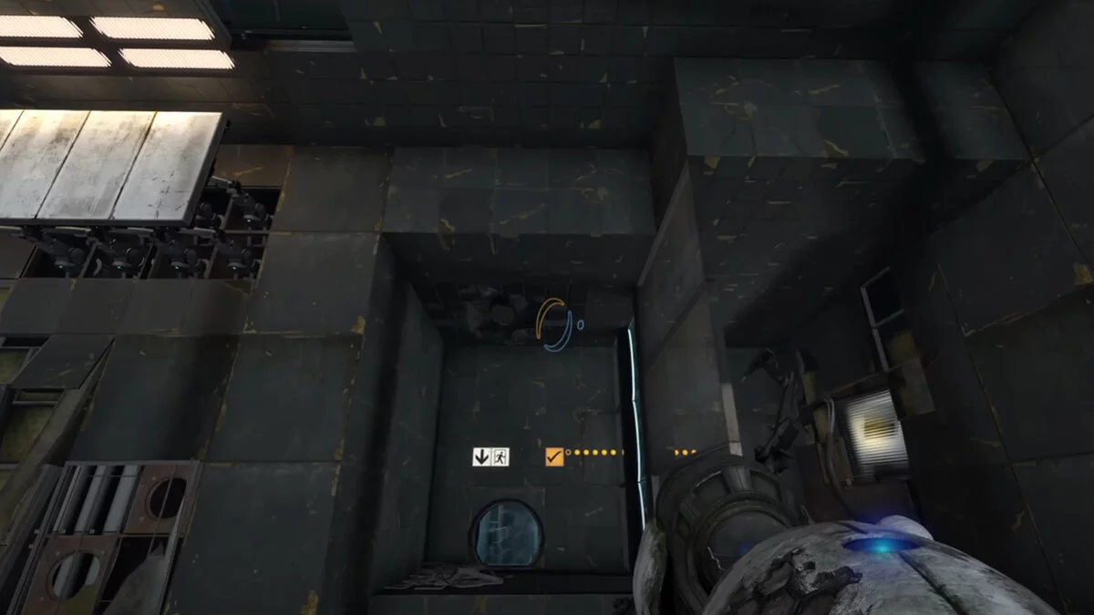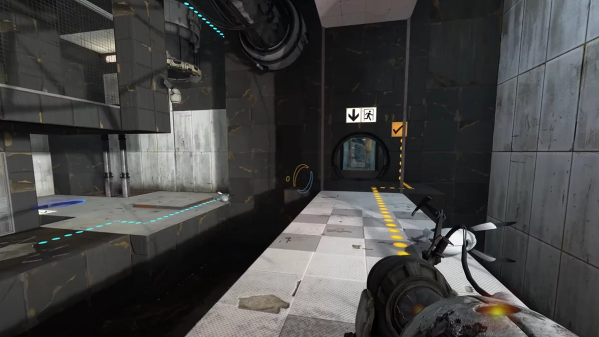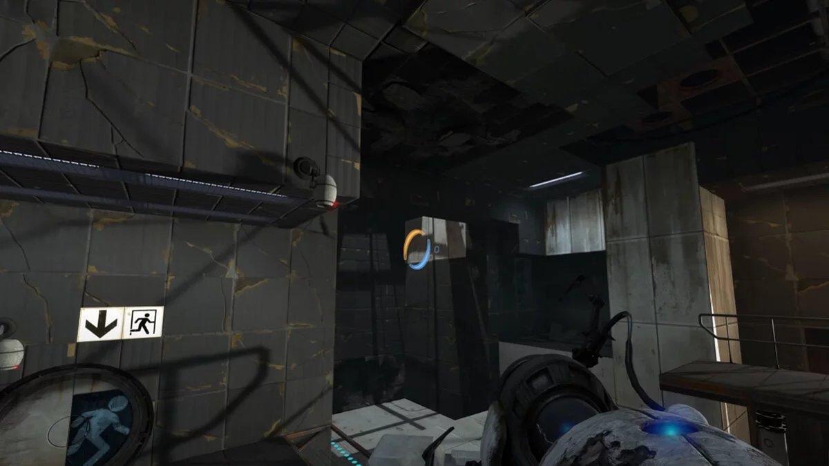 Открываем врата повыше, чтобы можно было обойти трубу. Следующий портал размещаем возле разбитых стёкол. В комнате, чуть дальше, спрыгиваем между перилами.