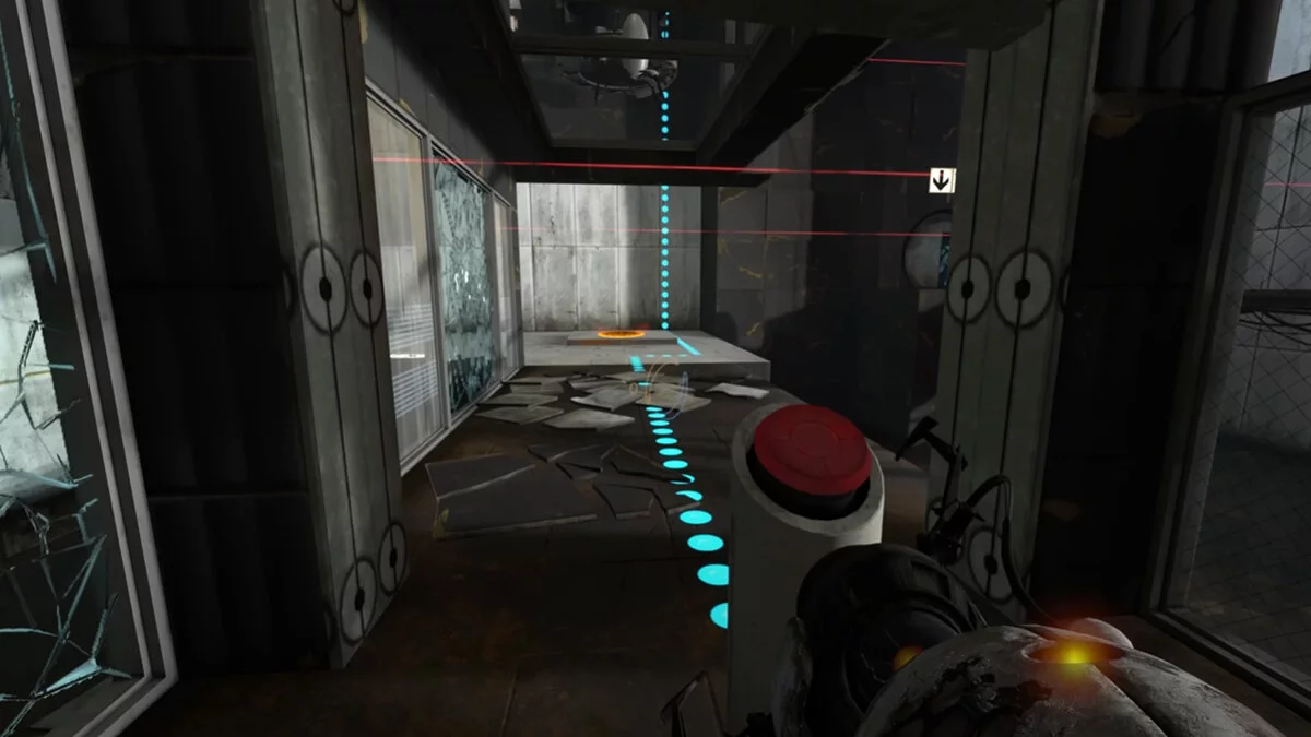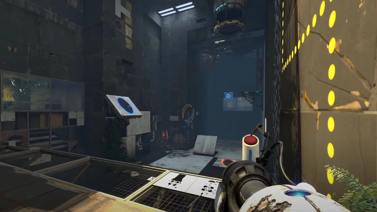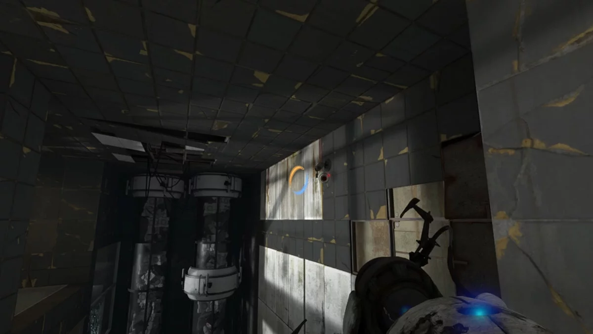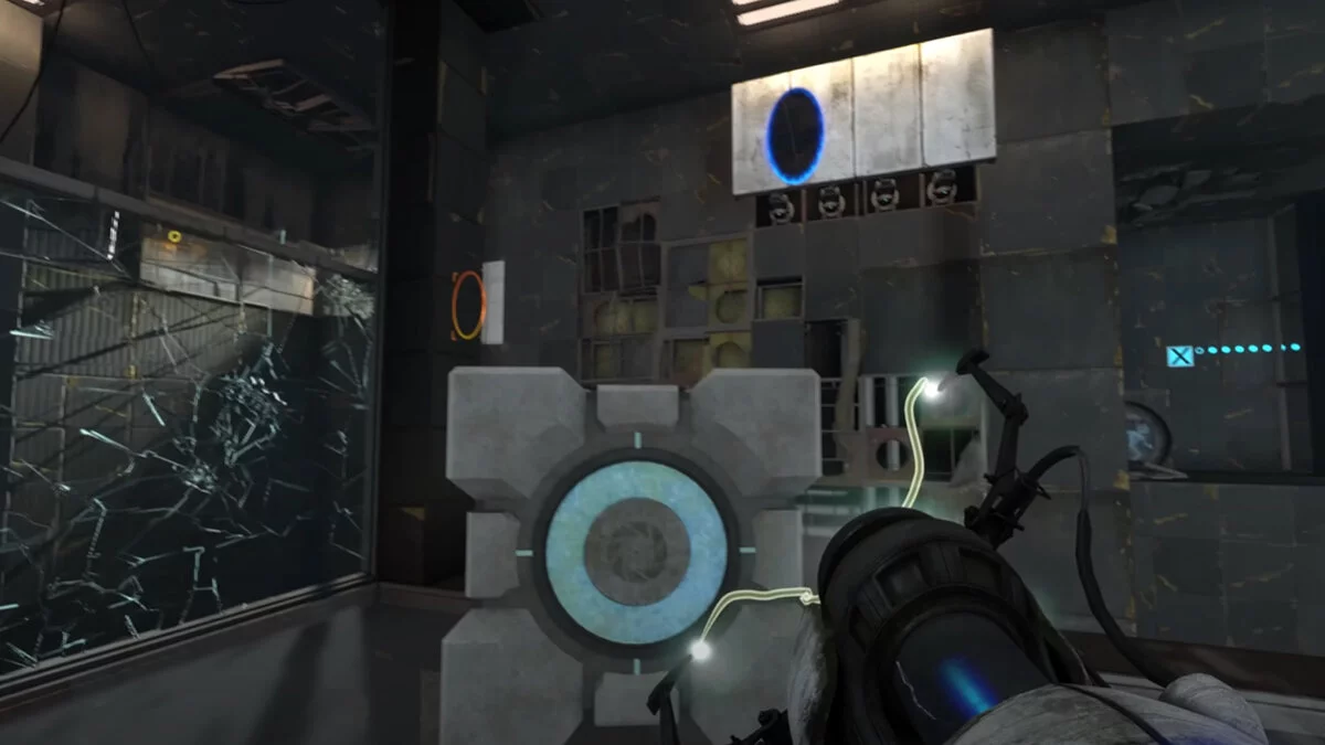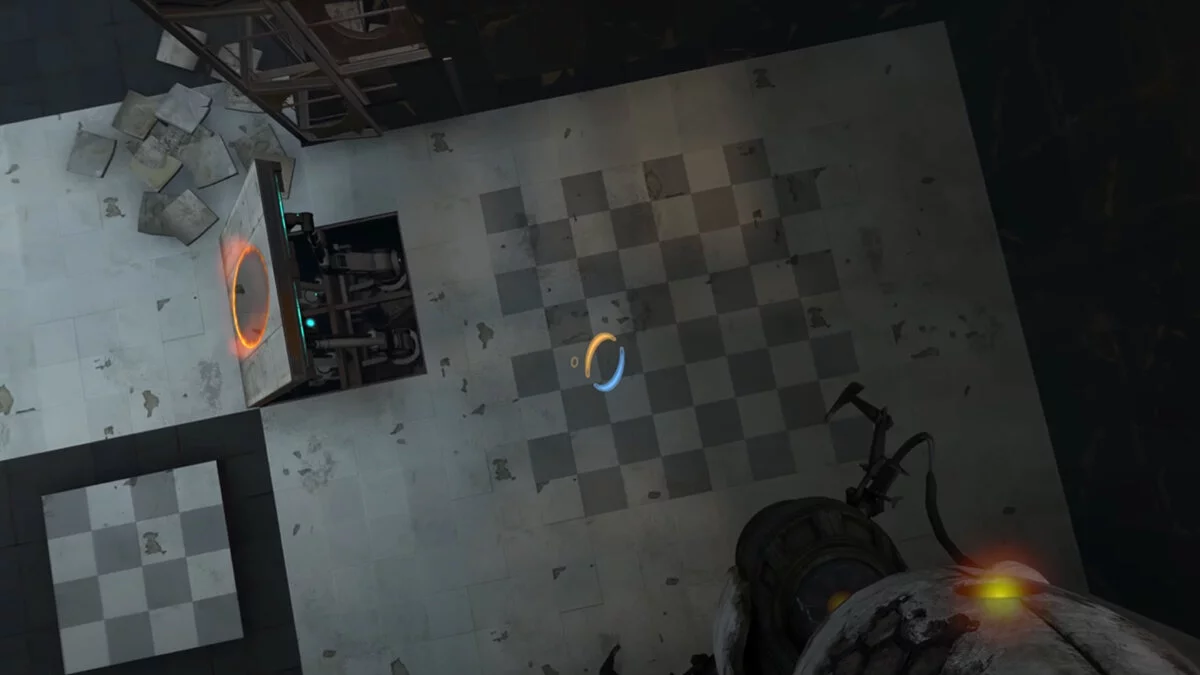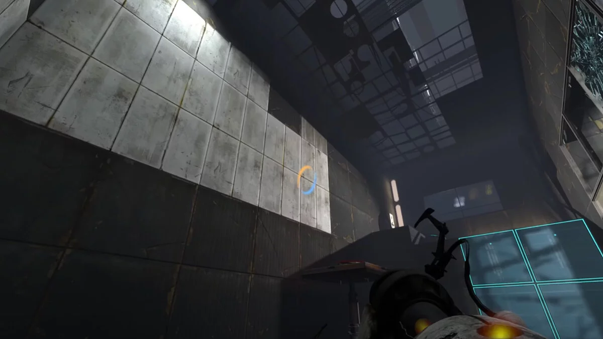 Открываем врата повыше, чтобы можно было обойти трубу. Следующий портал размещаем возле разбитых стёкол. В комнате, чуть дальше, спрыгиваем между перилами.