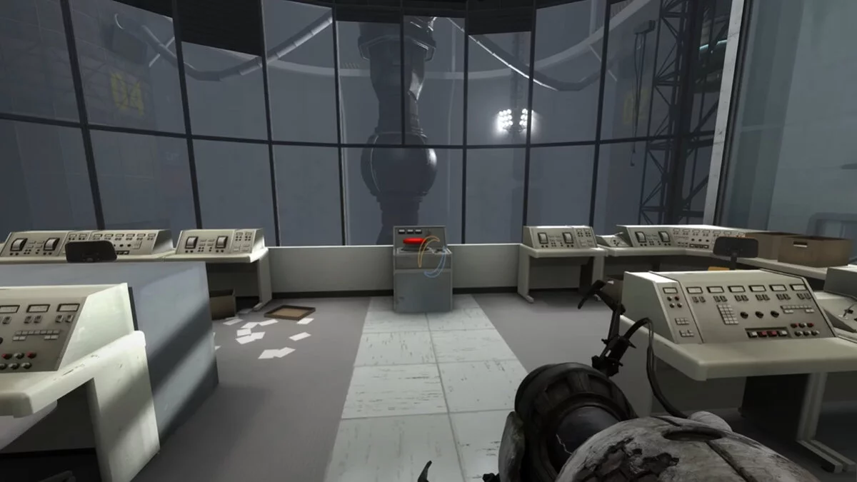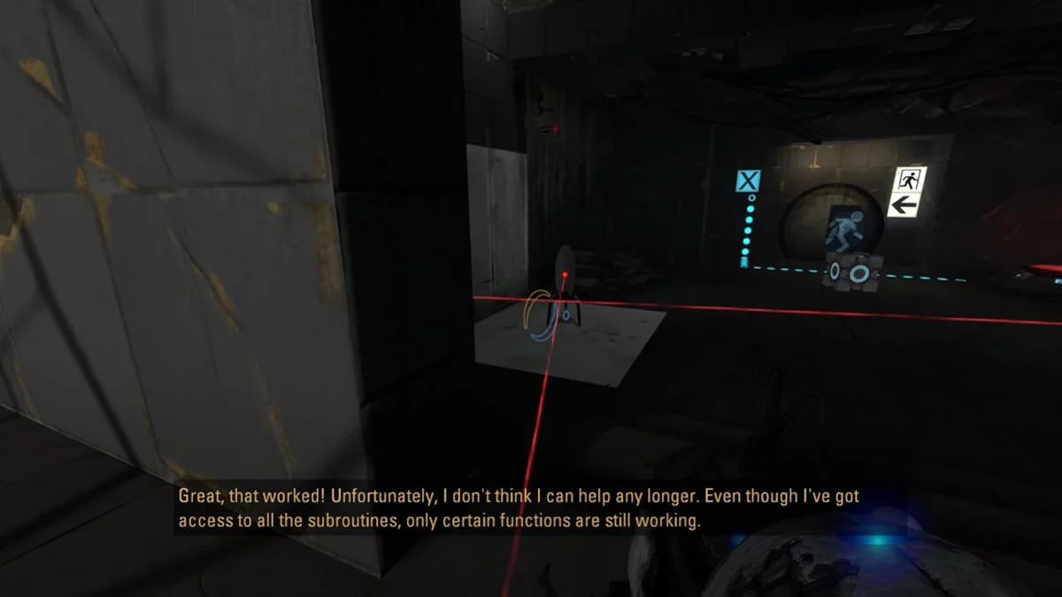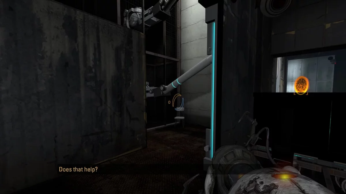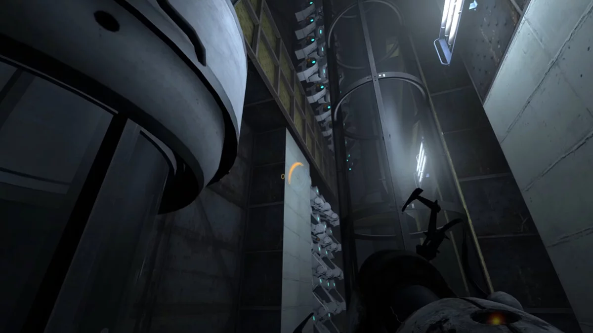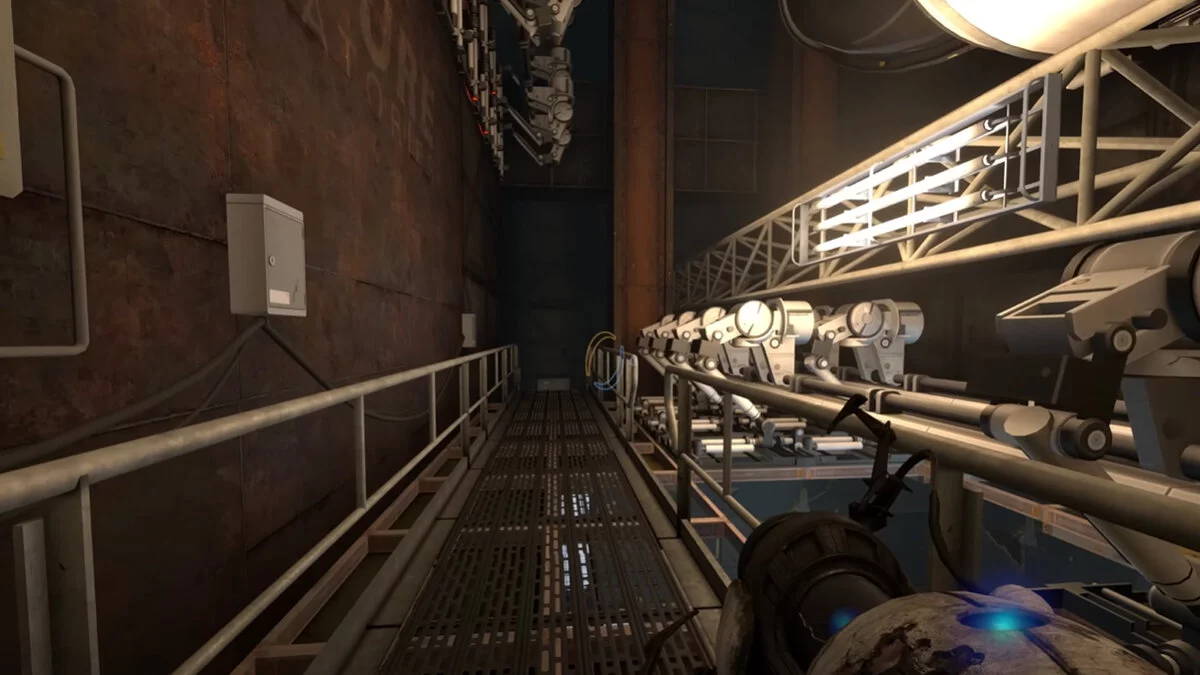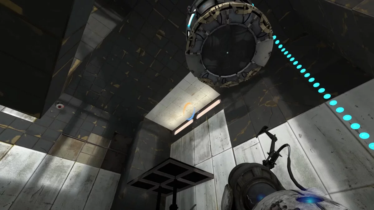 Открываем врата повыше, чтобы можно было обойти трубу. Следующий портал размещаем возле разбитых стёкол. В комнате, чуть дальше, спрыгиваем между перилами.