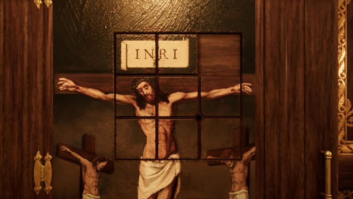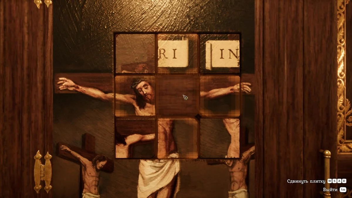 В этом задании вам встретится сразу несколько головоломок. Добравшись до храма, войдите в сакристию и осмотрите комнату. На двери шкафа вы увидите мини-игру «Пятнашки». Нужно правильно переместить квадраты, чтобы получилось изображение, как на скриншоте ниже.