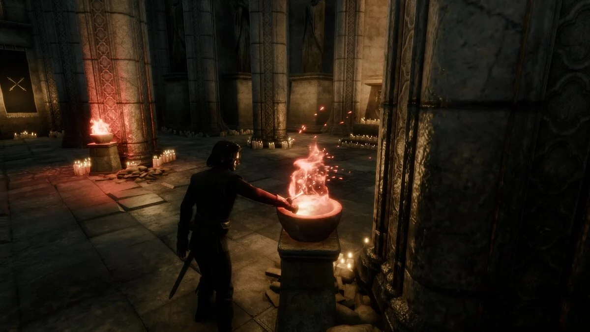 Заберите свечу и подойдите к жаровне с Благодатным огнём. Зажгите свечу, затем пройдите по залу и зажгите оставшиеся жаровни в произвольной последовательности.