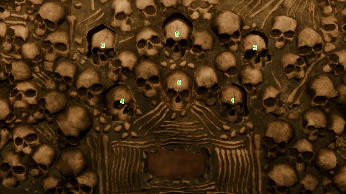 Сразу же после предыдущей головоломки вы попадёте в огромный зал со статуей и несколькими жаровнями для Благодатного огня. Отправляйтесь к статуе и нажмите на черепа в определённой последовательности: