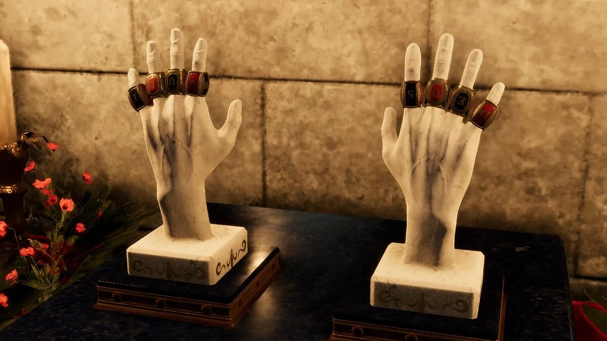 Откройте шкаф и заберите ключ. Однако перед этим рекомендуем осмотреть кольца кардинала, установленные на двух каменных руках. Их комбинация понадобится для открытия двери к секретную комнату библиотеки.