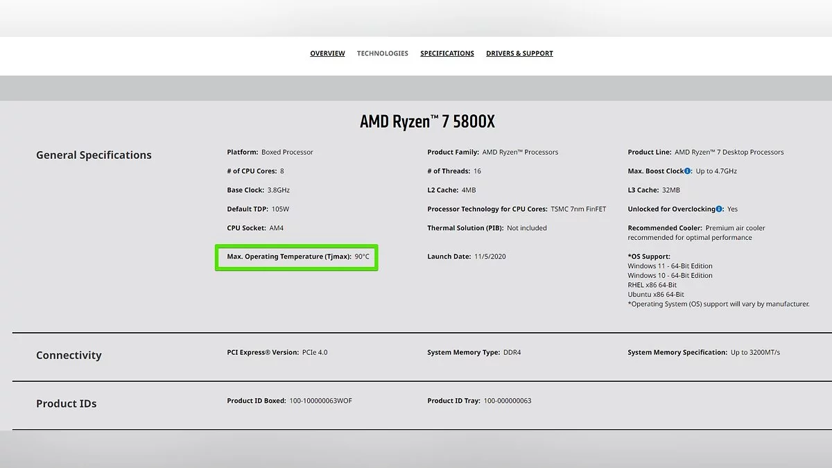 Чтобы проверить рабочую температуру своего процессора, достаточно перейти на официальный сайт разработчика и отыскать параметры компонента по модели или серийному номеру. Например, для моего процессора максимальная рабочая температура — 90 градусов Цельсия. Всё, что выше, уже не является нормой и в долгосрочной перспективе может негативно сказаться на устройстве.
