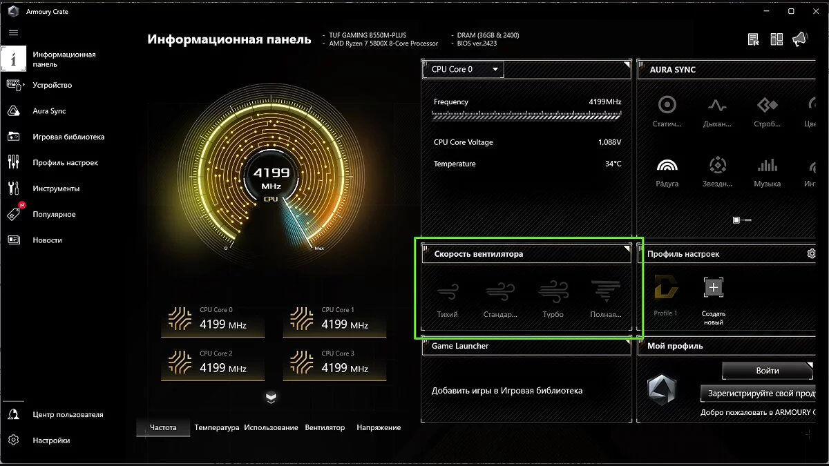 Современные материнские платы поставляются со специальными приложениями, при помощи которых можно регулировать скорость вращение вентиляторов. Например, для материнских плат Asus можно установить программу Armoury Crate.