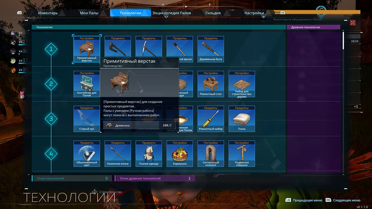 «Технологии» — рецепты, изучая которые вы сможете строить новые сооружения. Все технологии разделены по уровням, а на освоение тратятся очки, которые начисляются за каждый новый уровень. В этом же разделе вы увидите графу «древние технологии». Это особый вид рецептов, открыть которые можно только после победы над боссами. Каждый босс даст вам несколько очков древних технологий.
